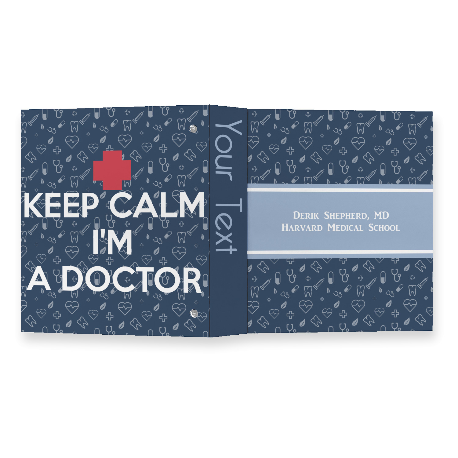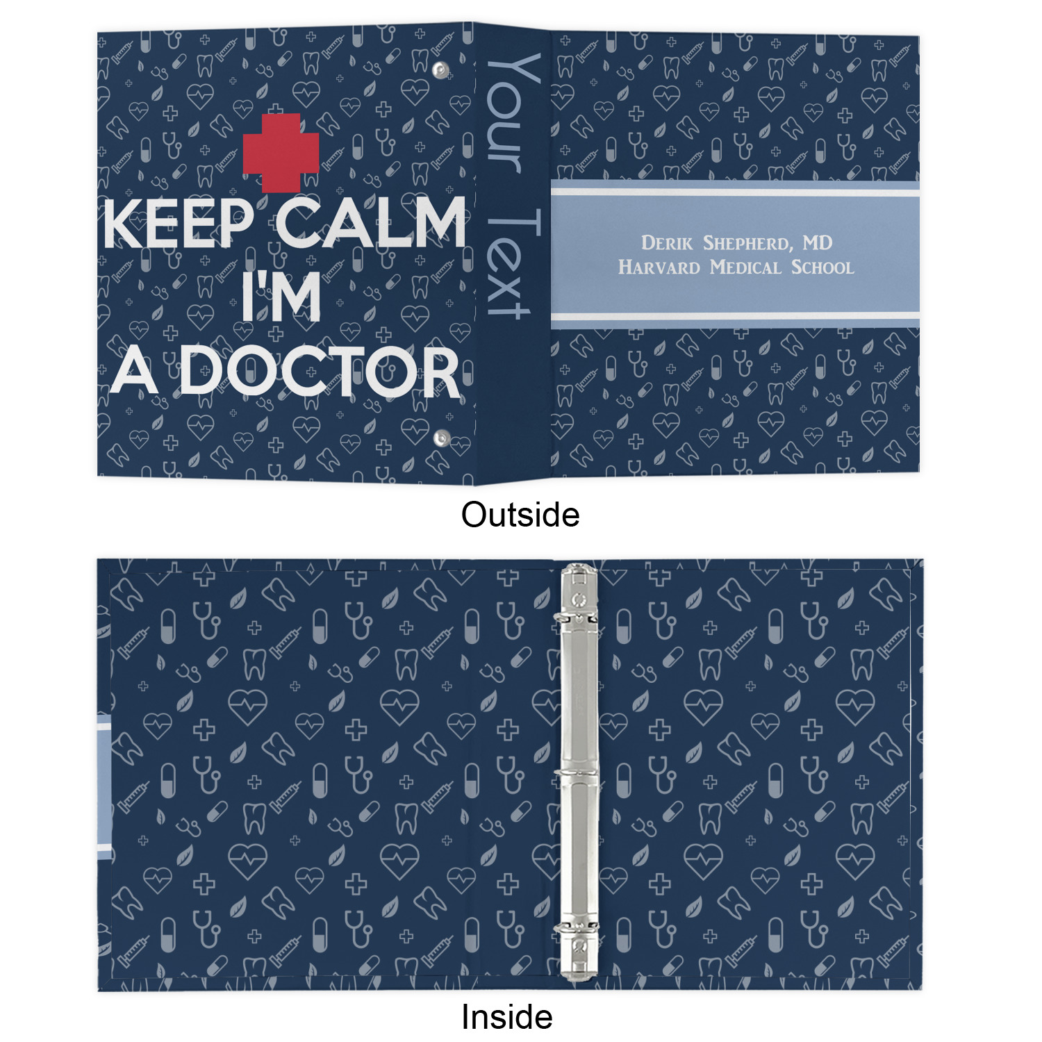 This design features a subtle background with different medical symbols. It is a navy blue with cream accents. There is a large ribbon where your personalization goes! The coordinating design features a quote that says "keep calm, I'm a doctor." This is such a fun design for any medical doctor!