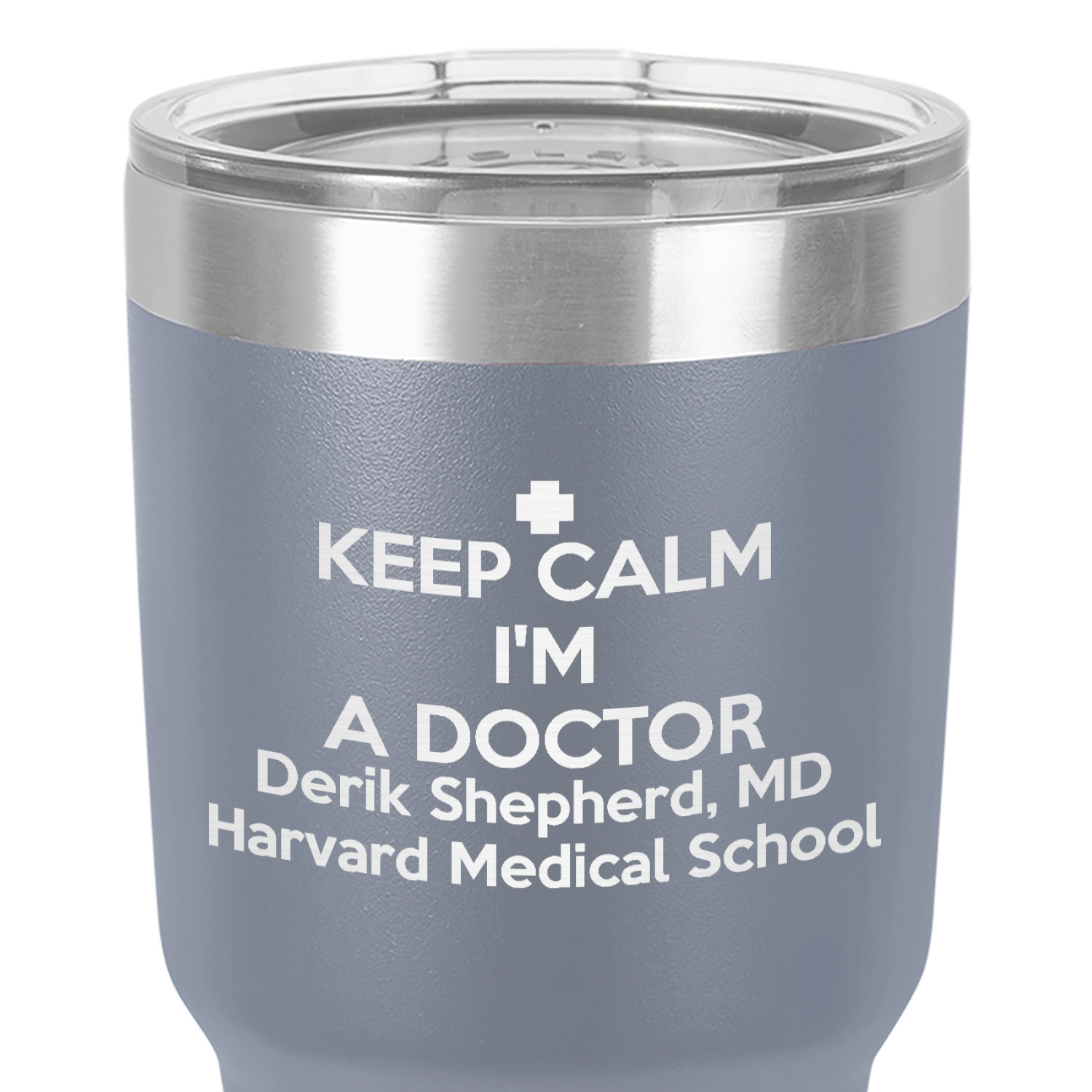 This design features a subtle background with different medical symbols. It is a navy blue with cream accents. There is a large ribbon where your personalization goes! The coordinating design features a quote that says "keep calm, I'm a doctor." This is such a fun design for any medical doctor!