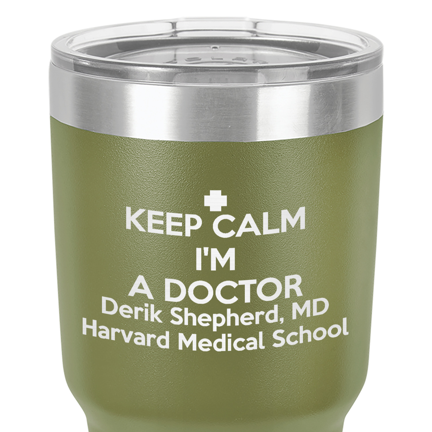 This design features a subtle background with different medical symbols. It is a navy blue with cream accents. There is a large ribbon where your personalization goes! The coordinating design features a quote that says "keep calm, I'm a doctor." This is such a fun design for any medical doctor!