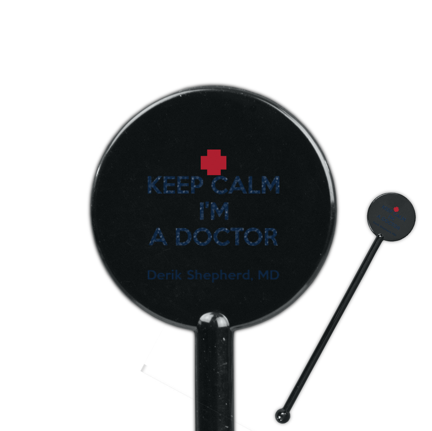 This design features a subtle background with different medical symbols. It is a navy blue with cream accents. There is a large ribbon where your personalization goes! The coordinating design features a quote that says "keep calm, I'm a doctor." This is such a fun design for any medical doctor!
