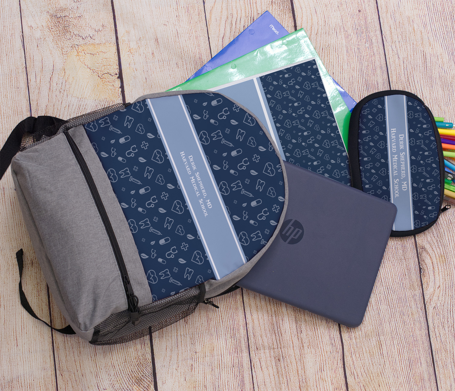 This design features a subtle background with different medical symbols. It is a navy blue with cream accents. There is a large ribbon where your personalization goes! The coordinating design features a quote that says "keep calm, I'm a doctor." This is such a fun design for any medical doctor!