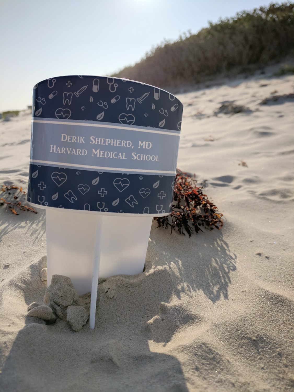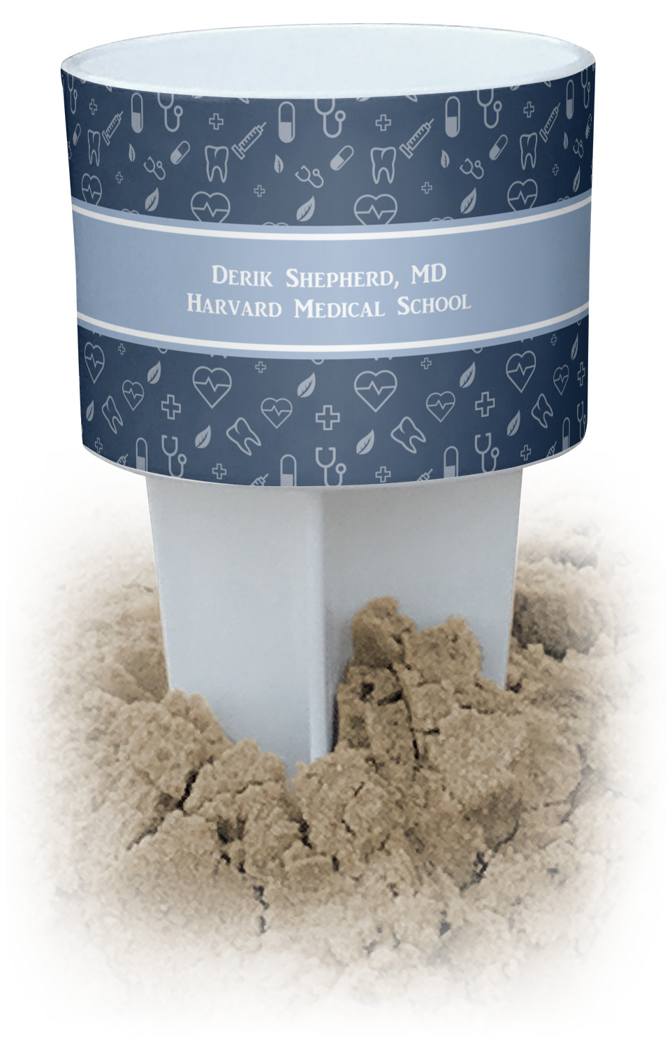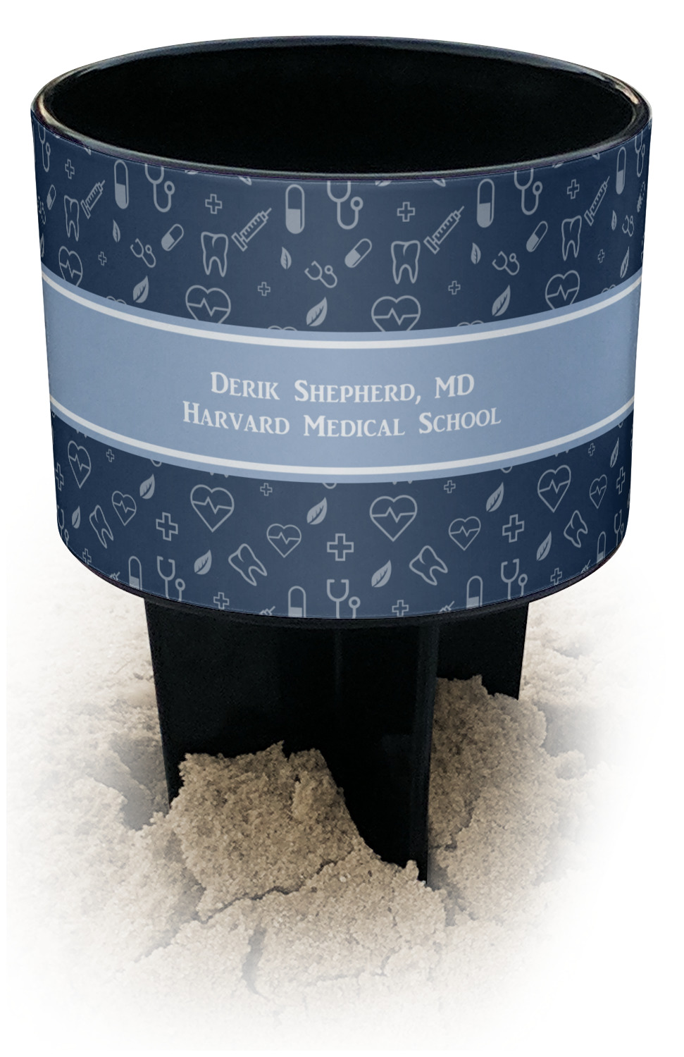 This cup holder has a large stake at its bottom that anchors it to the sand or ground below, while the cup holder rests above the stake. The entire drink holder is made of durable plastic and displays your customization around the cup holder portion. We sell these personalized beach spikers in two different colors: black and white.