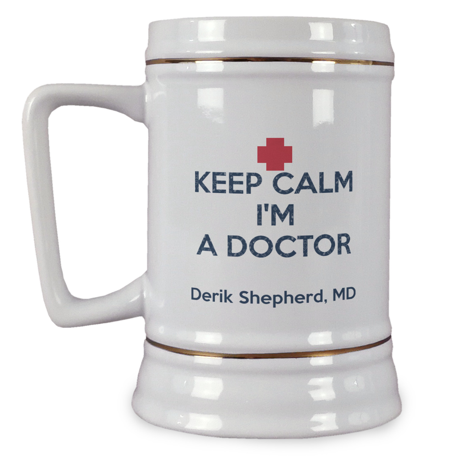 This design features a subtle background with different medical symbols. It is a navy blue with cream accents. There is a large ribbon where your personalization goes! The coordinating design features a quote that says "keep calm, I'm a doctor." This is such a fun design for any medical doctor!