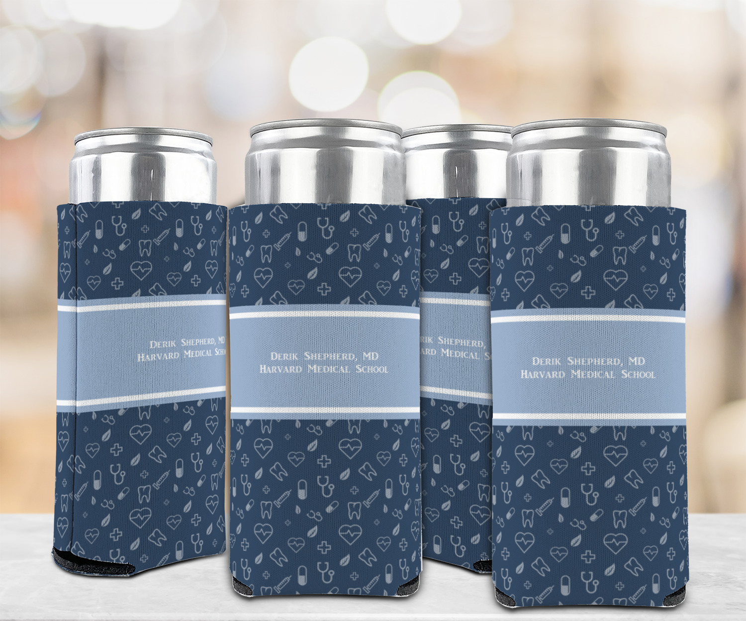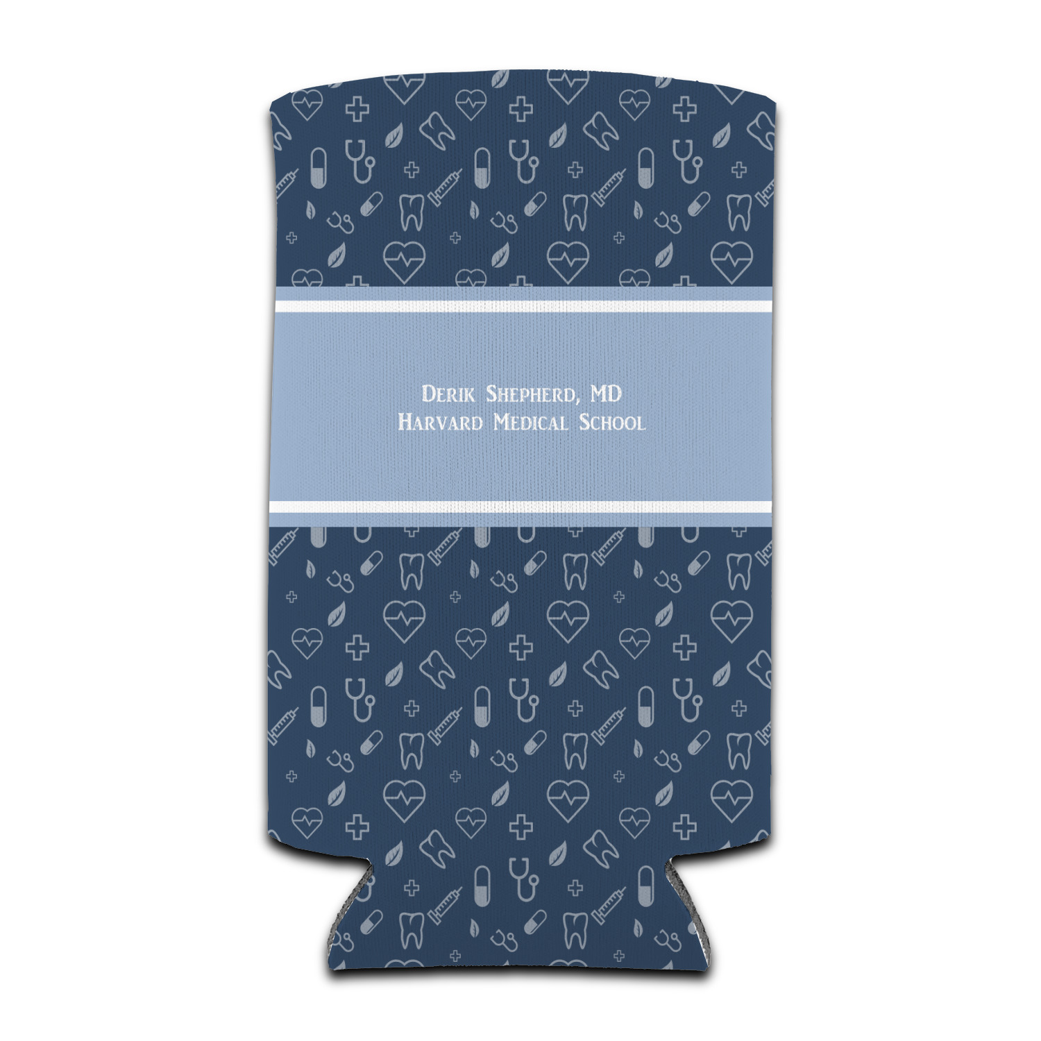 This design features a subtle background with different medical symbols. It is a navy blue with cream accents. There is a large ribbon where your personalization goes! The coordinating design features a quote that says "keep calm, I'm a doctor." This is such a fun design for any medical doctor!