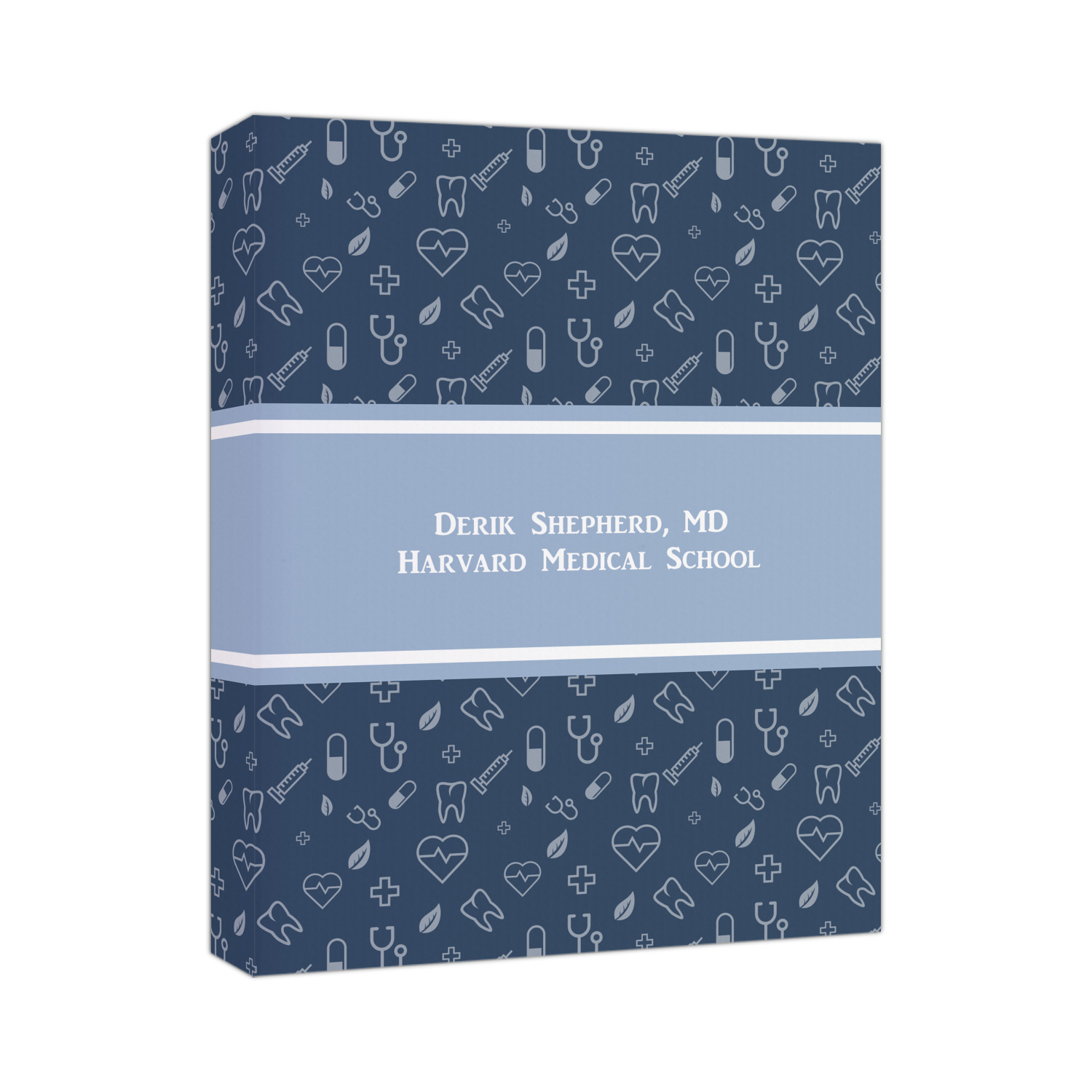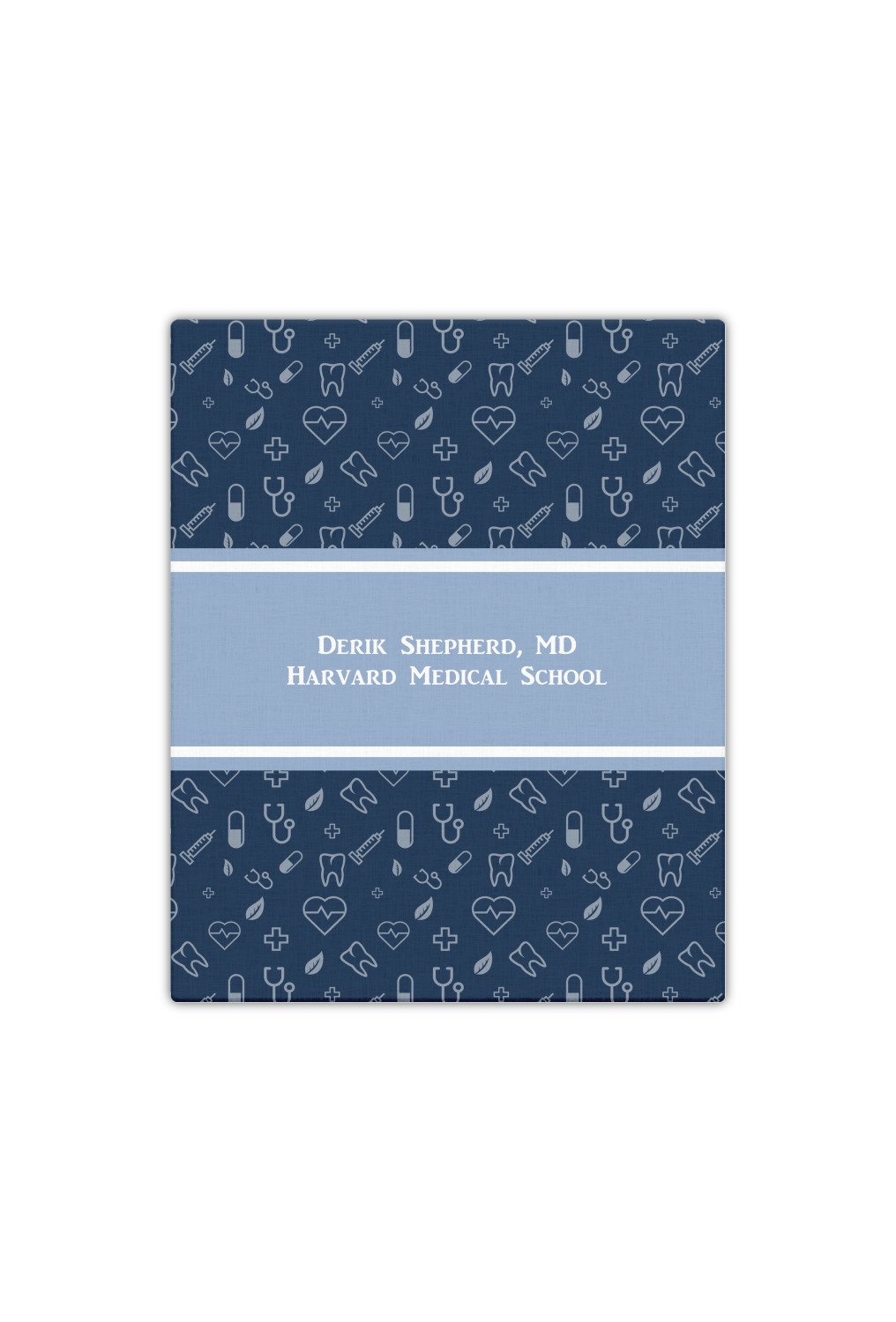 This design features a subtle background with different medical symbols. It is a navy blue with cream accents. There is a large ribbon where your personalization goes! The coordinating design features a quote that says "keep calm, I'm a doctor." This is such a fun design for any medical doctor!