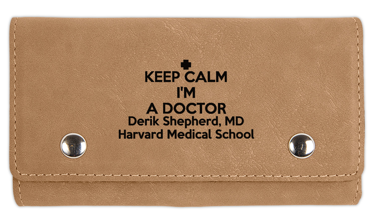This design features a subtle background with different medical symbols. It is a navy blue with cream accents. There is a large ribbon where your personalization goes! The coordinating design features a quote that says "keep calm, I'm a doctor." This is such a fun design for any medical doctor!