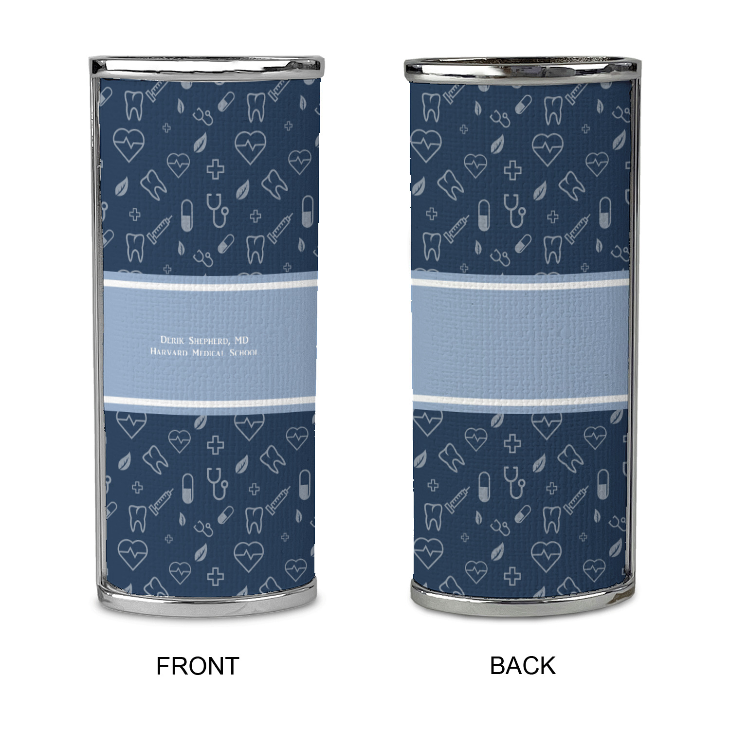 This design features a subtle background with different medical symbols. It is a navy blue with cream accents. There is a large ribbon where your personalization goes! The coordinating design features a quote that says "keep calm, I'm a doctor." This is such a fun design for any medical doctor!