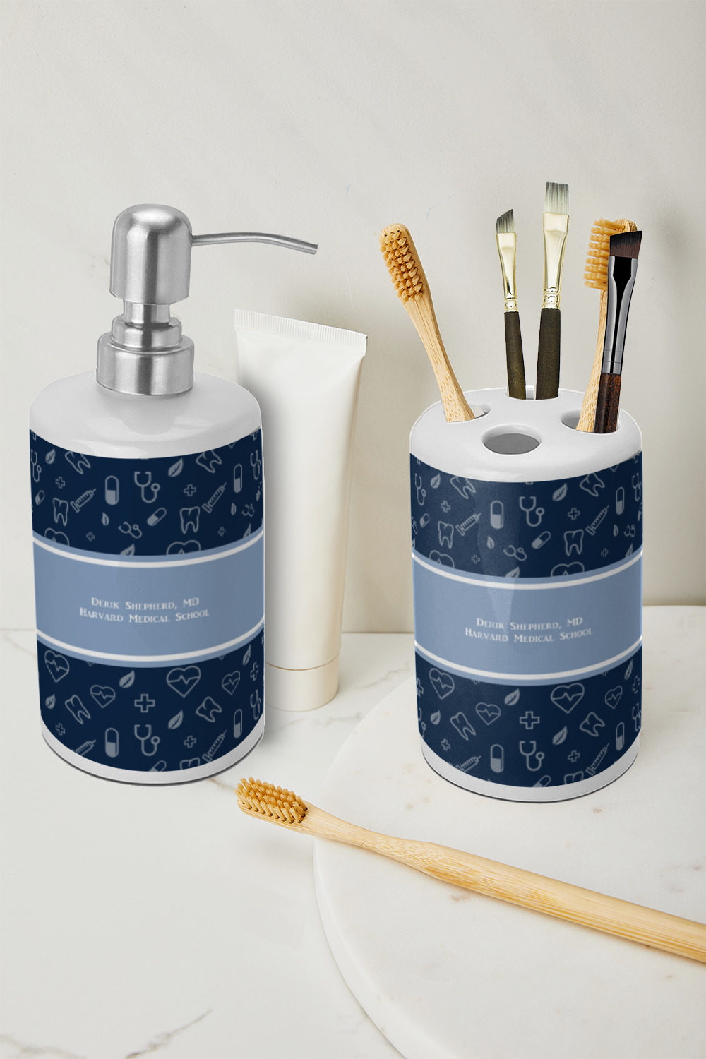 This design features a subtle background with different medical symbols. It is a navy blue with cream accents. There is a large ribbon where your personalization goes! The coordinating design features a quote that says "keep calm, I'm a doctor." This is such a fun design for any medical doctor!