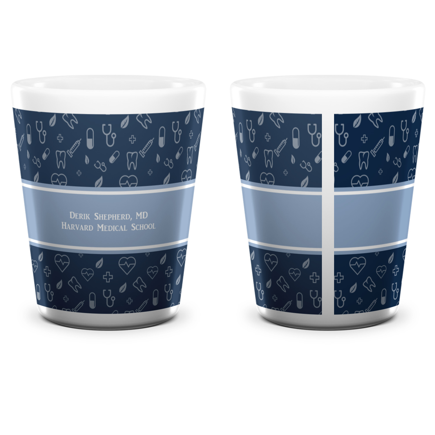 This design features a subtle background with different medical symbols. It is a navy blue with cream accents. There is a large ribbon where your personalization goes! The coordinating design features a quote that says "keep calm, I'm a doctor." This is such a fun design for any medical doctor!
