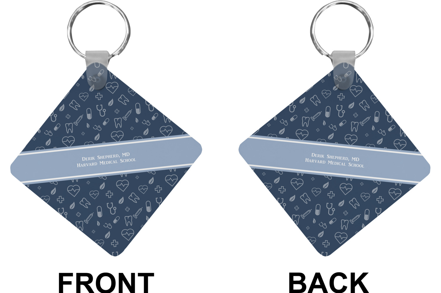 Our personalized keychains attach to the included metal, split key ring with a plastic, removable snap. Since a metal ring is included with your purchase, you have the liberty to keep your keys together on the ring, with or without your unique keychain. We offer this keychain in three different shapes: circle, heart, or diamond. We print your personalized design(s) on both sides of the key chain, and the surface has a glossy, reflective finish that only emphasizes your design. Each keychain is approximately 2.25 by 2.25 inches.
