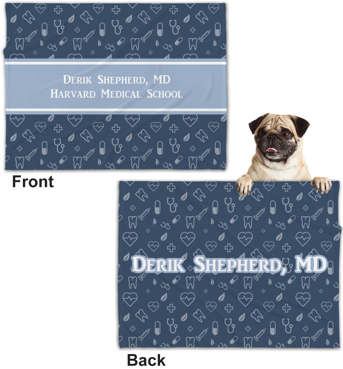 These dog blankets are crafted from a gentle, soft-to-the-touch, minky material. We print your customizations, either matching or differing, on both the top and underside of the blanket. These personalized dog blankets are available in two sizes: regular and large. Our regular size, at 40" x 30", accommodates small and some medium size dogs. At 60" x 50", our large dog blanket is a better fit for bigger breeds. Though specialized for dogs, these blankets still make a thoughtful gift for your favorite feline, or any other pet in mind!
