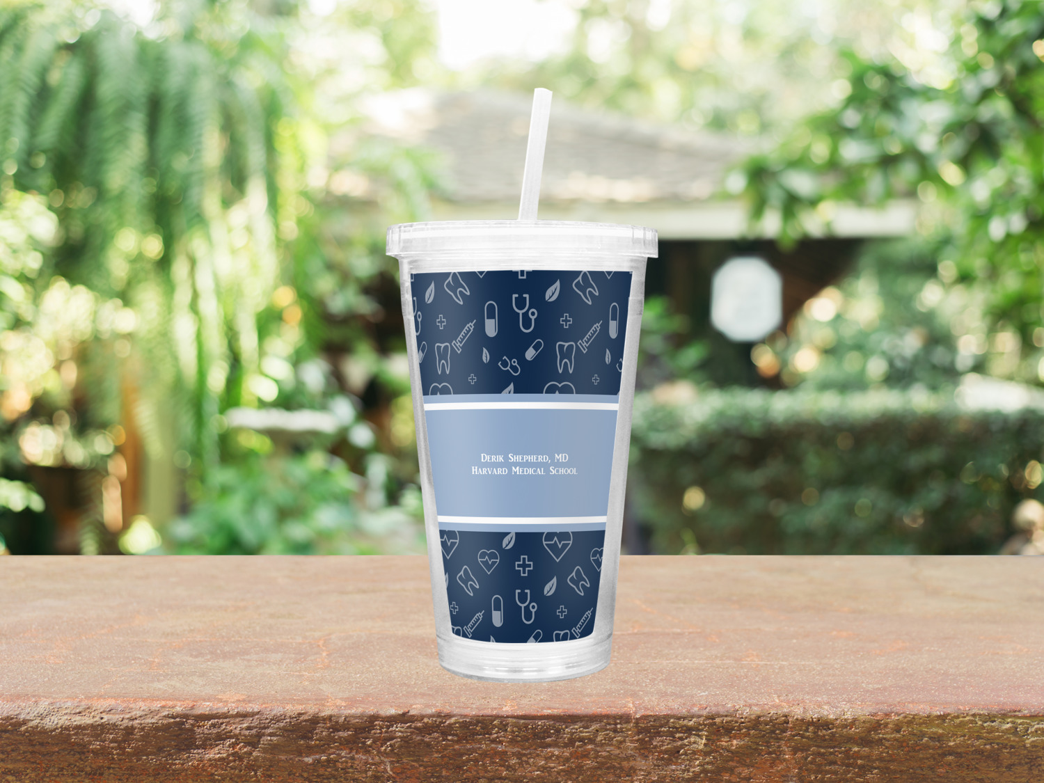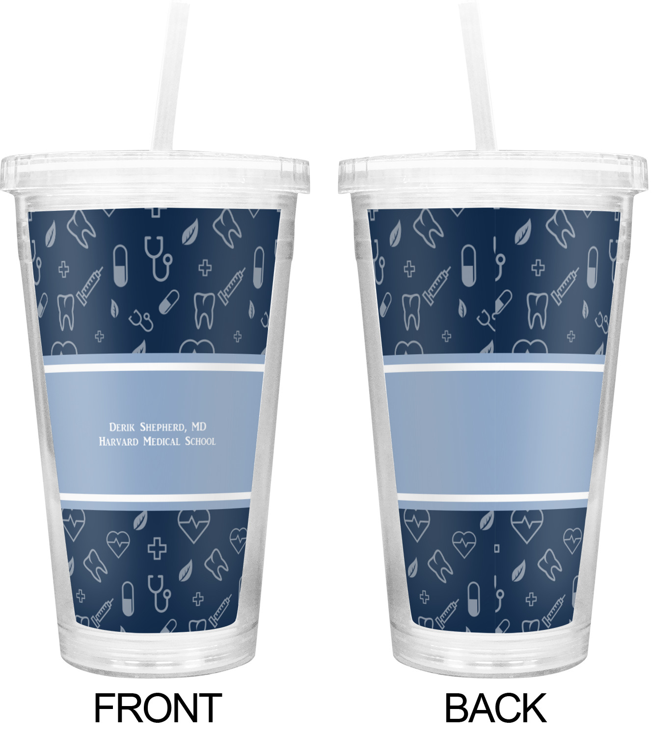This design features a subtle background with different medical symbols. It is a navy blue with cream accents. There is a large ribbon where your personalization goes! The coordinating design features a quote that says "keep calm, I'm a doctor." This is such a fun design for any medical doctor!