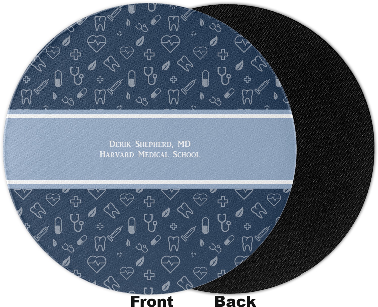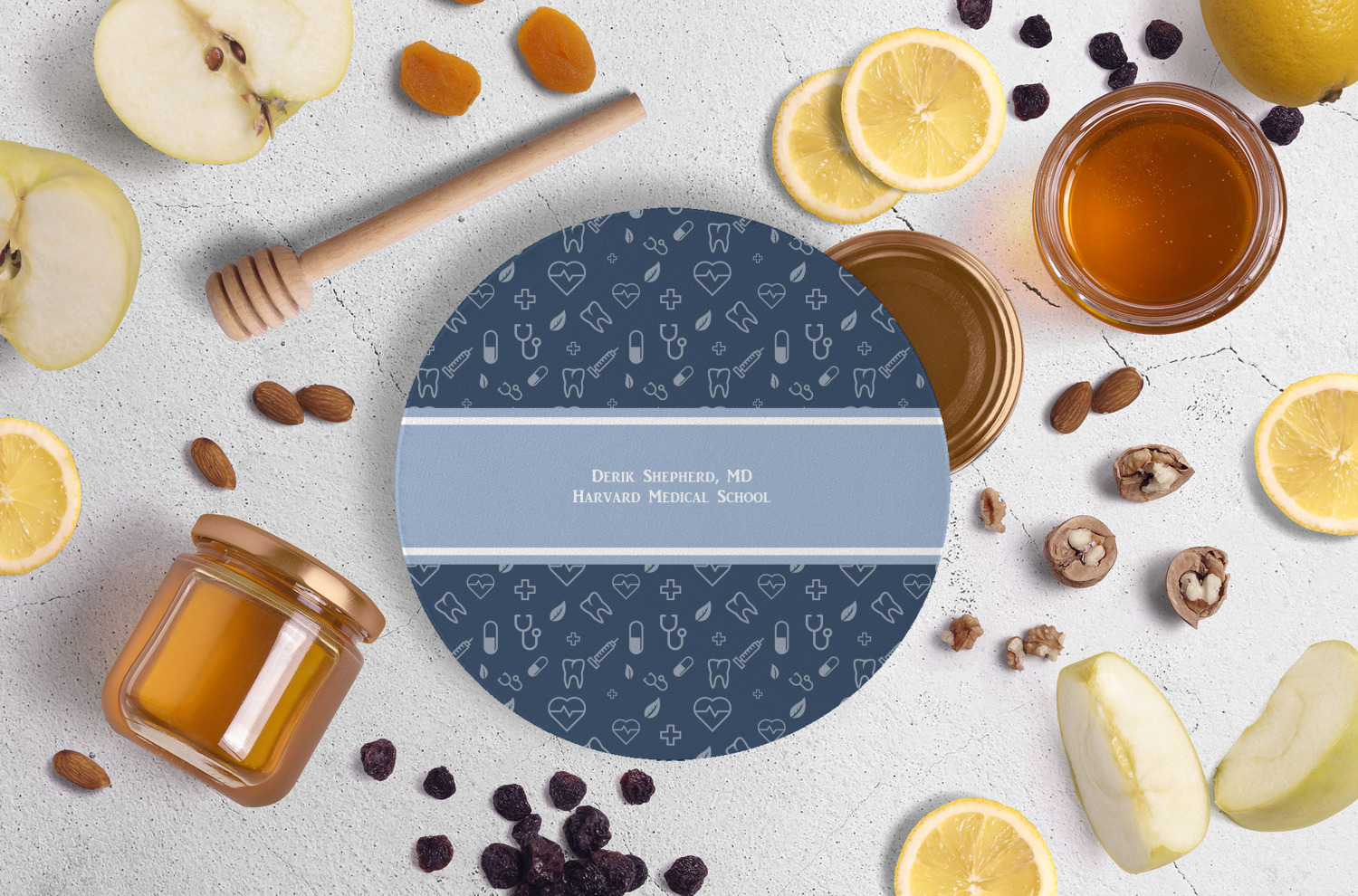 This design features a subtle background with different medical symbols. It is a navy blue with cream accents. There is a large ribbon where your personalization goes! The coordinating design features a quote that says "keep calm, I'm a doctor." This is such a fun design for any medical doctor!