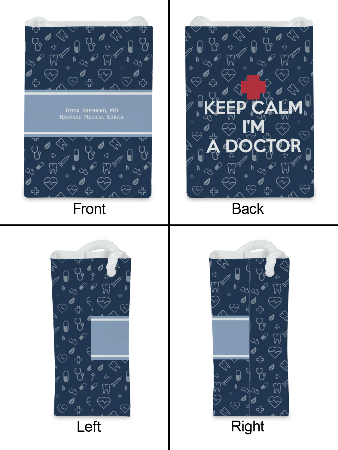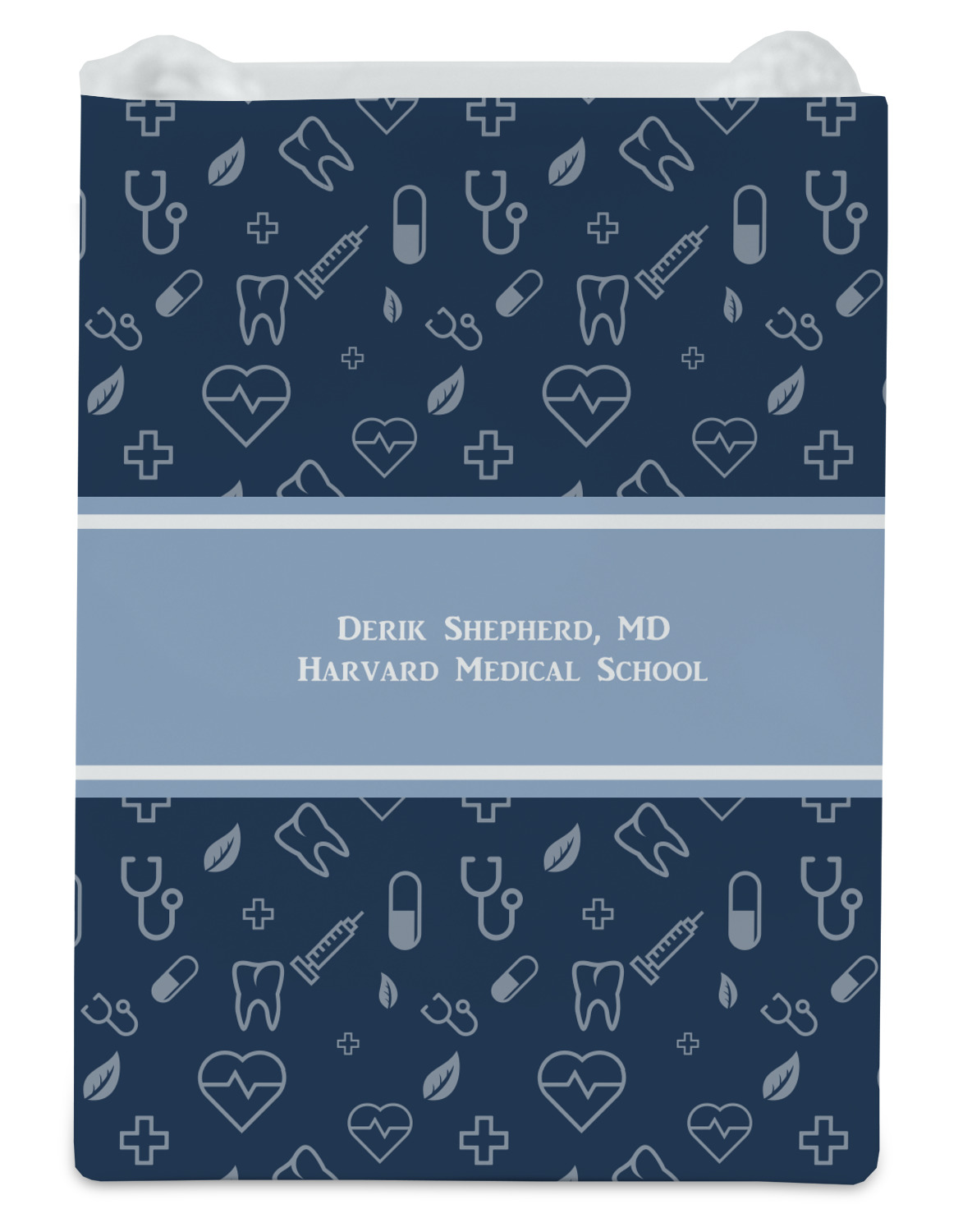 This design features a subtle background with different medical symbols. It is a navy blue with cream accents. There is a large ribbon where your personalization goes! The coordinating design features a quote that says "keep calm, I'm a doctor." This is such a fun design for any medical doctor!
