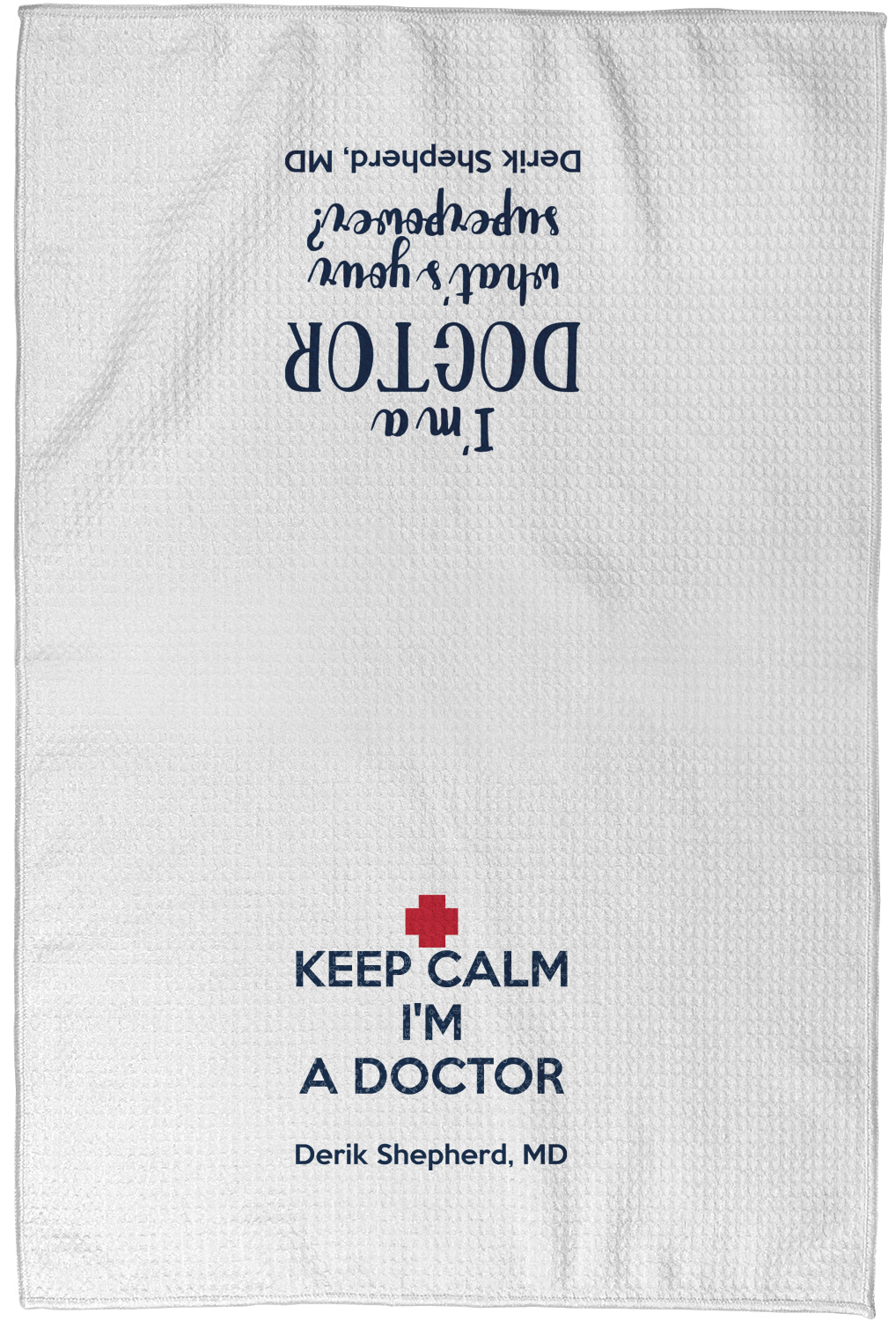This design features a subtle background with different medical symbols. It is a navy blue with cream accents. There is a large ribbon where your personalization goes! The coordinating design features a quote that says "keep calm, I'm a doctor." This is such a fun design for any medical doctor!