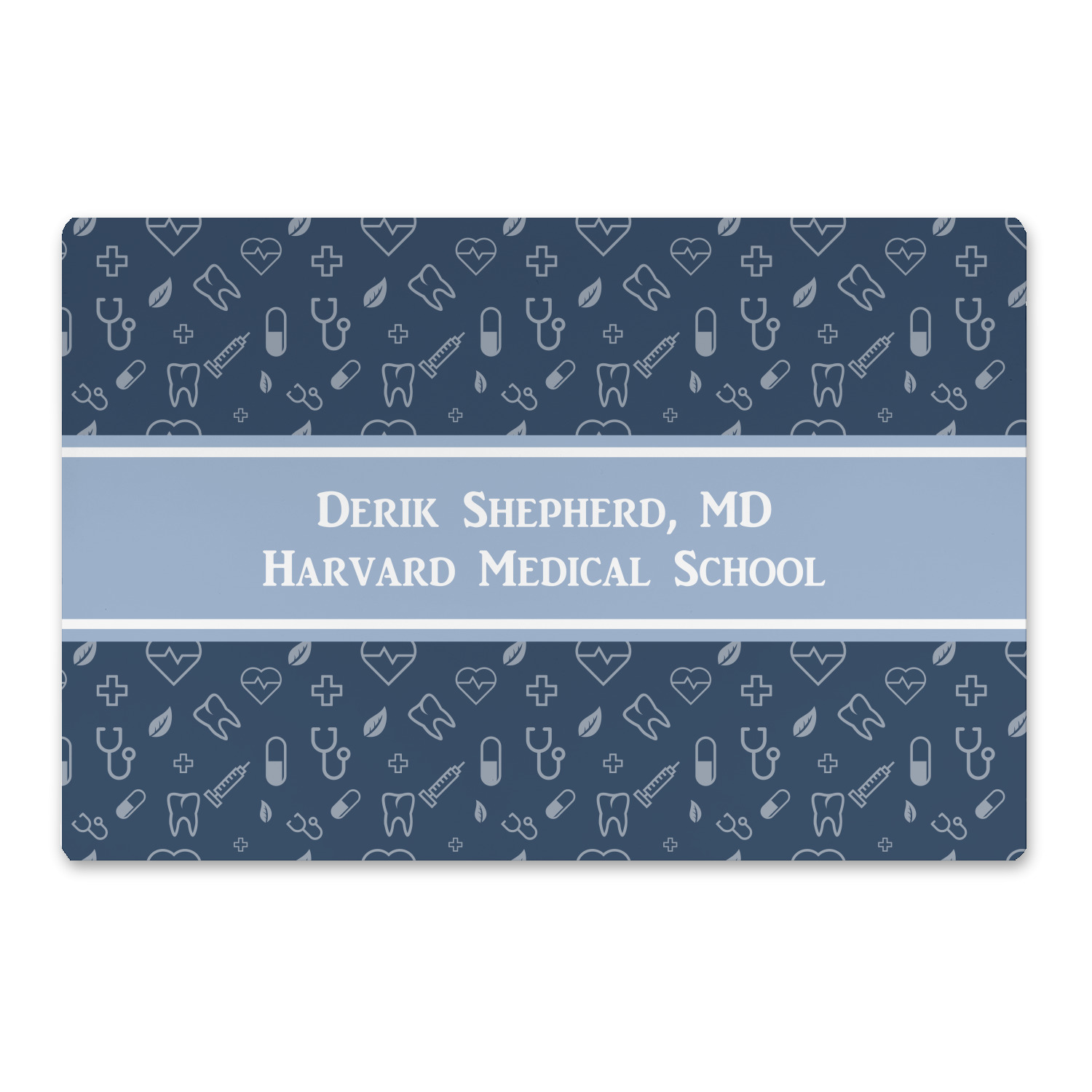 This design features a subtle background with different medical symbols. It is a navy blue with cream accents. There is a large ribbon where your personalization goes! The coordinating design features a quote that says "keep calm, I'm a doctor." This is such a fun design for any medical doctor!