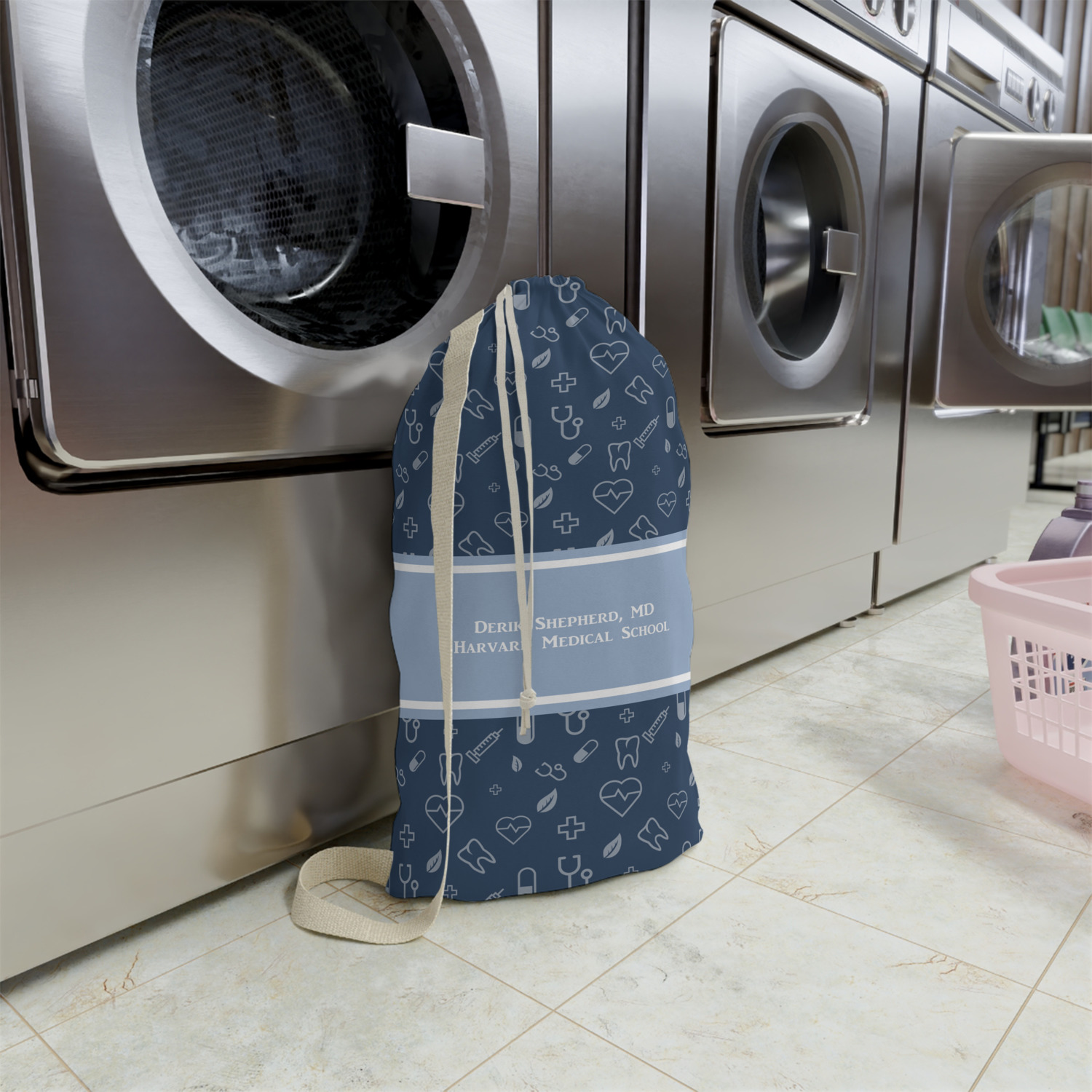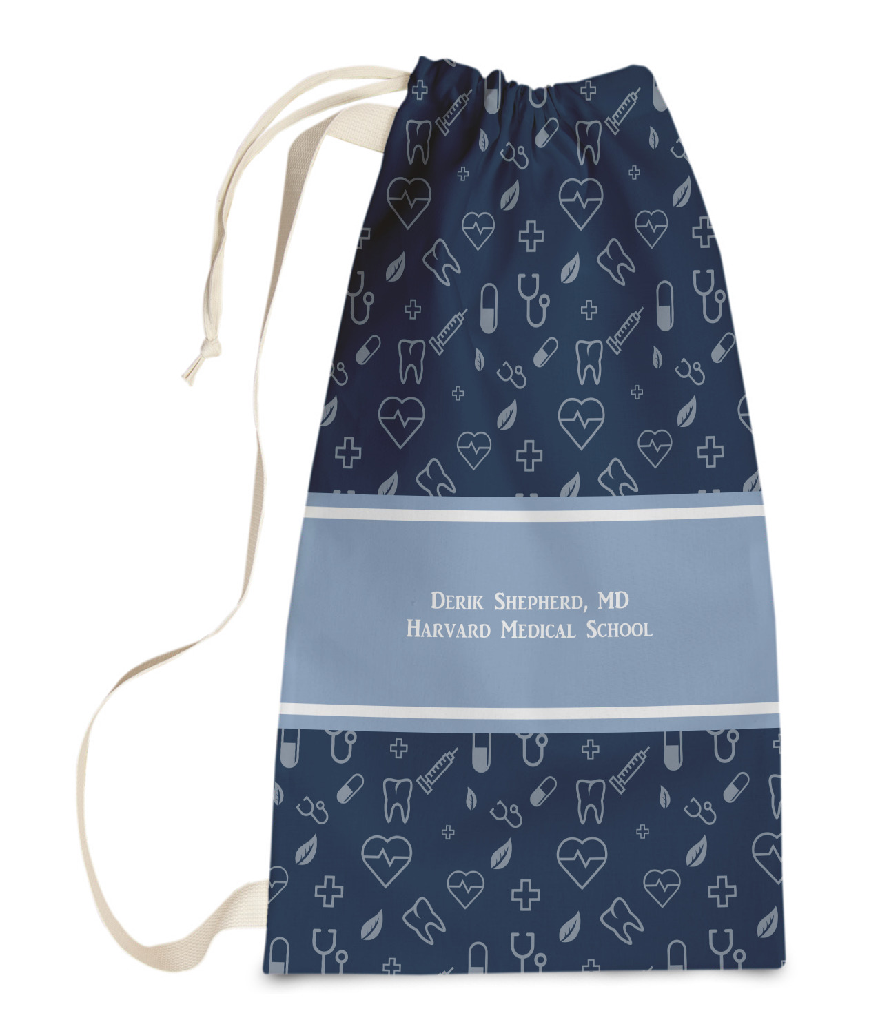 Carry your laundry in style with these customized laundry bags. Available in two sizes, featuring a natural colored woven strap and a cinch cord, these bags hold a lot of clothes or anything else you want to fit in them.