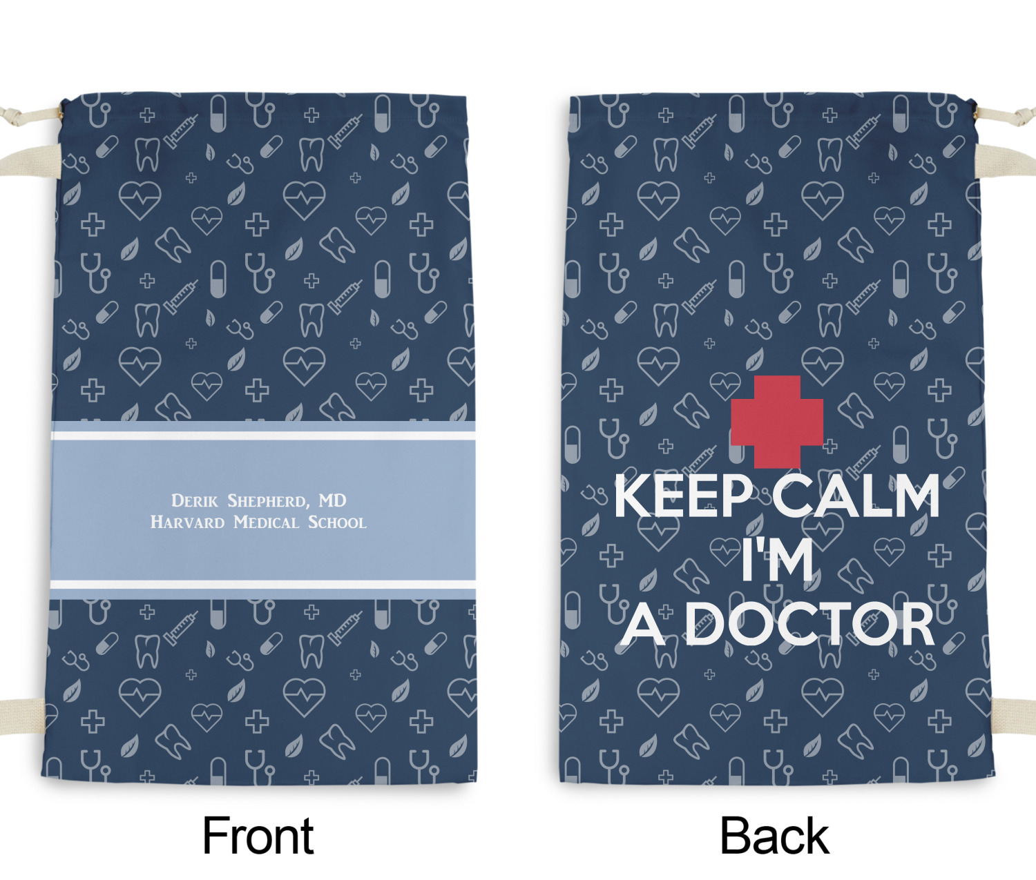 This design features a subtle background with different medical symbols. It is a navy blue with cream accents. There is a large ribbon where your personalization goes! The coordinating design features a quote that says "keep calm, I'm a doctor." This is such a fun design for any medical doctor!