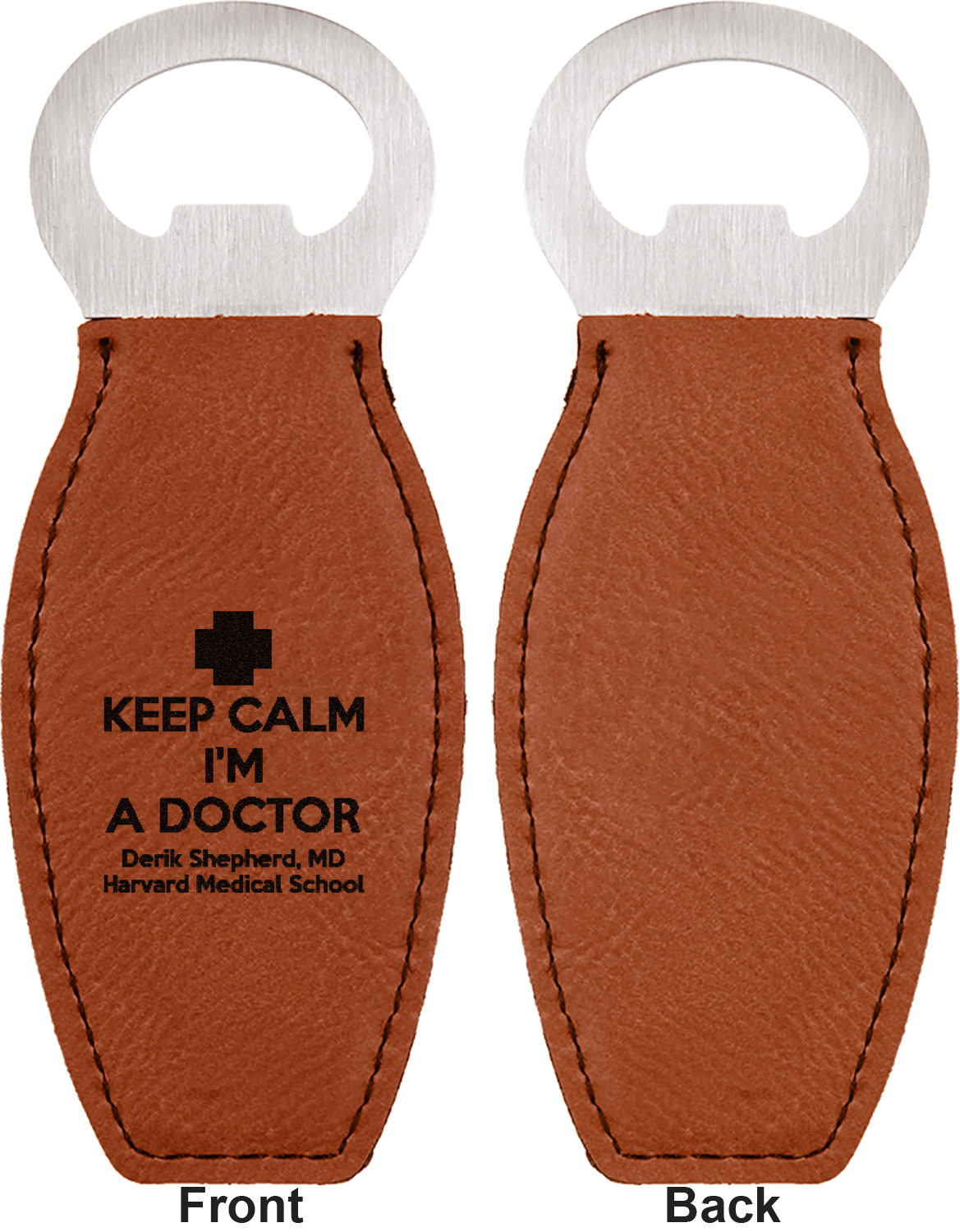 Built from stainless steel, these custom bottle openers are wrapped in a cognac-colored leatherette. Sharp, black stitching lines the edges for extra durability and a finished touch. Your personalization is laser-engraved onto the surface of this leatherette, leaving behind a crisp, black coloration. At 4.6 by 1.8 inches, this beer bottle opener gives you much of leverage when trying to open a stubborn bottle. On the opposite end of the opener, you'll find a magnet that you can use to display your new, unique bottle opener!
