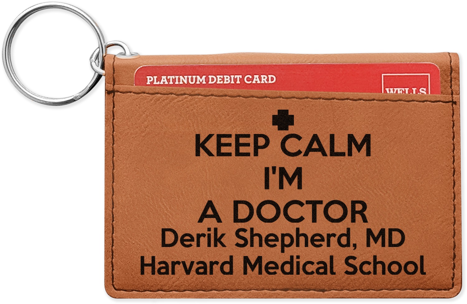 These ID wallet keychains features three pockets on the inside to accommodate your ID and your most frequently used cards. Another pocket occupies the front of the wallet's exterior, and can hold some cash or another card. The wallet is accompanied by a thick metal ring for easy attachment to a belt clip or purse. Each card holder keychain measures at 4.25 by 3 inches and is a beautiful, cognac, medium-brown shade. The personalized monogram, font, or graphic of your choosing is laser engraved into the surface of the wallet, creating a black imprint. We sell these ID wallets in two models: single sided and double sided engraving.