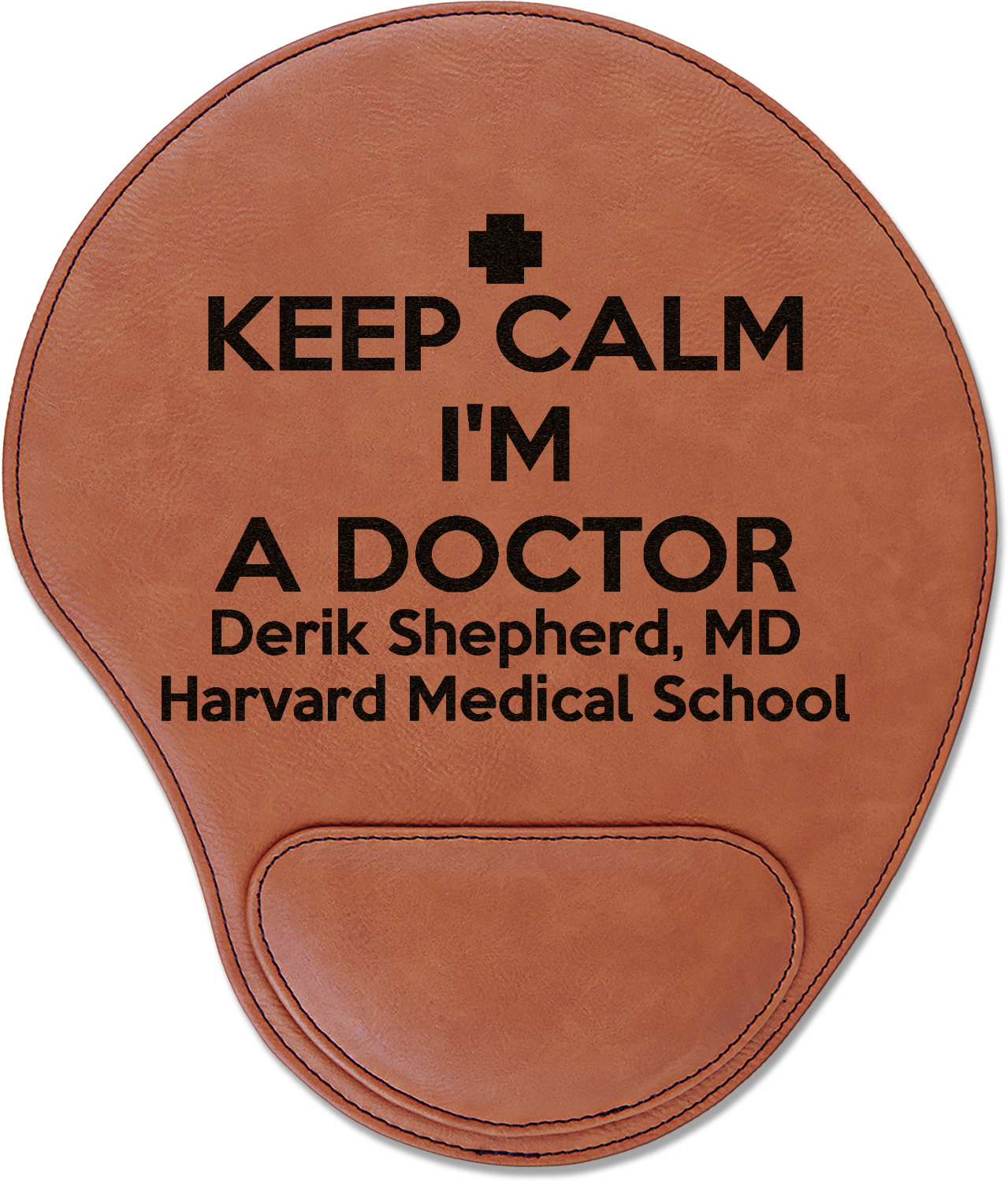 In a rounded shape, this mouse pad is made of a luxurious, cognac-colored leatherette. The nature of this material allows your mouse to glide smoothly across its surface. Strong stitching lines the edges to guarantee stability and strength. As added support for tired wrists, your personalized mouse pad features a supportive wrist rest at its bottom. This model measures at 10.25" x 9", while its wrist pad is approximately 5" x 2.75", with a thickness of 0.75". Your personalized design is laser engraved into the front face of this mouse pad.