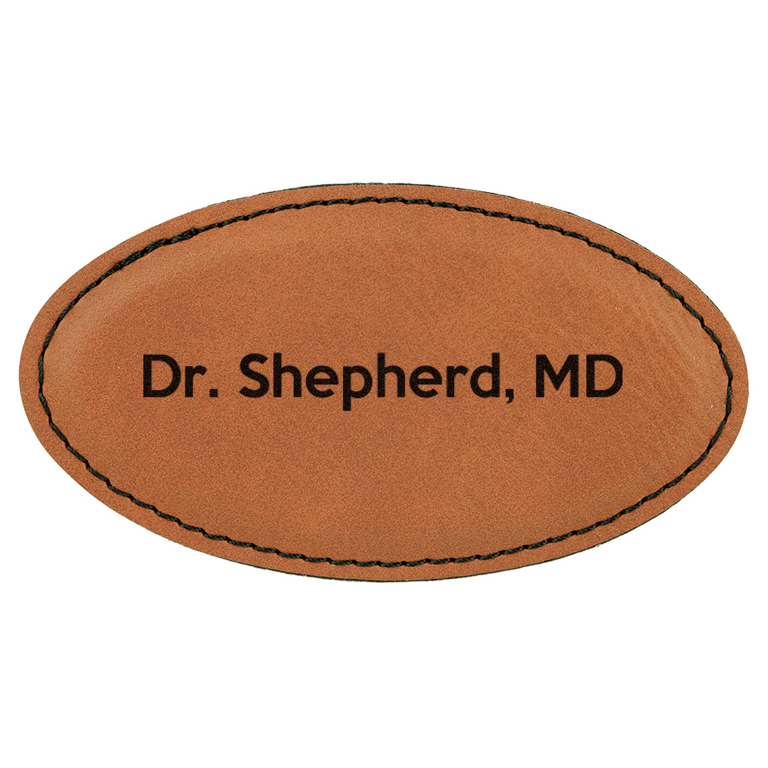 Made from a cognac-brown leatherette into an oval shape, these custom name badges measure at around 3.25" x 1.75". To add the suave appearance of this custom badge, a fine black stitching lines the edges or the badge itself. Your customized design is laser-engraved onto the surface of the leatherette. Accompanying your purchase is a removable magnet strip that can be used to secure the engraved name tag to any shirt, dress, or jacket.