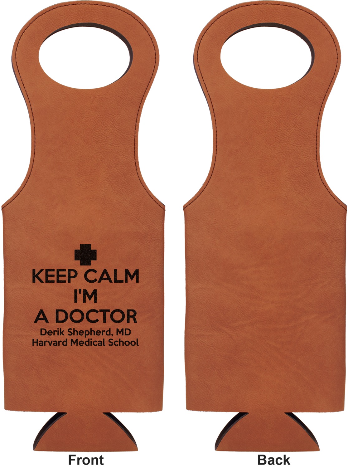 This wine carrier is made from a stunning leatherette, in a cognac-brown color. Strong, black stitching lines the sides of your wine bottle bag and provides extra durability. The interior is lined with a padded, black material to allow for a snug fit once your bottle is placed inside. At the top of this wine gift bag, you'll find two oval shaped handles that elegantly complements the rest of the bag's style. We provide you with the option of laser-engraving the front, or the front and back of your new personalized wine bag!