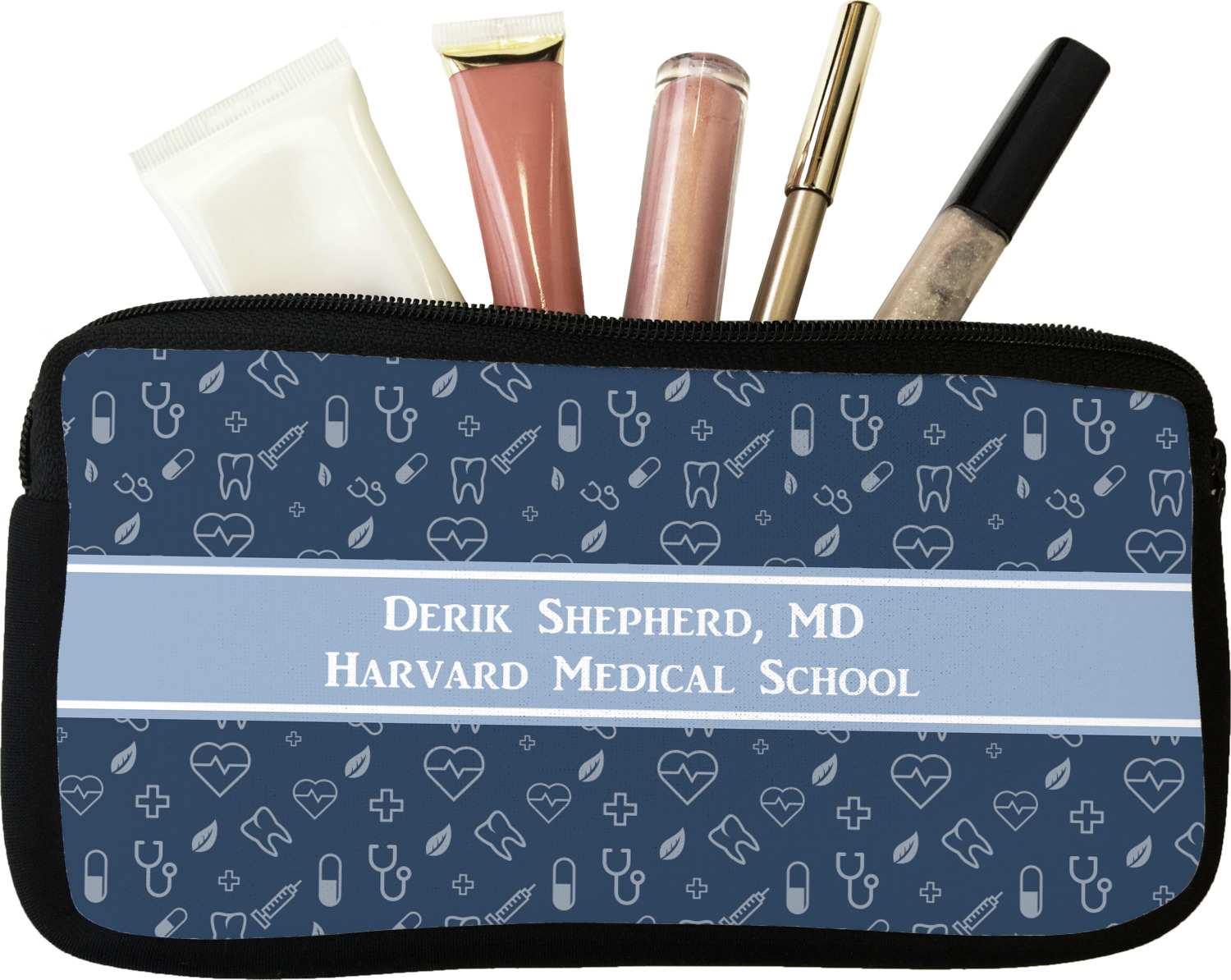 Our personalized makeup bags are available in many different designs, patterns and colors - so you are sure to find one that will love. They are made of neoprene (same material as wet-suits) and thus are water resistant, so spillages in your makeup bag will not end up all over you purse. They are customized on one side and are black on the other side and the zipper is black as well.