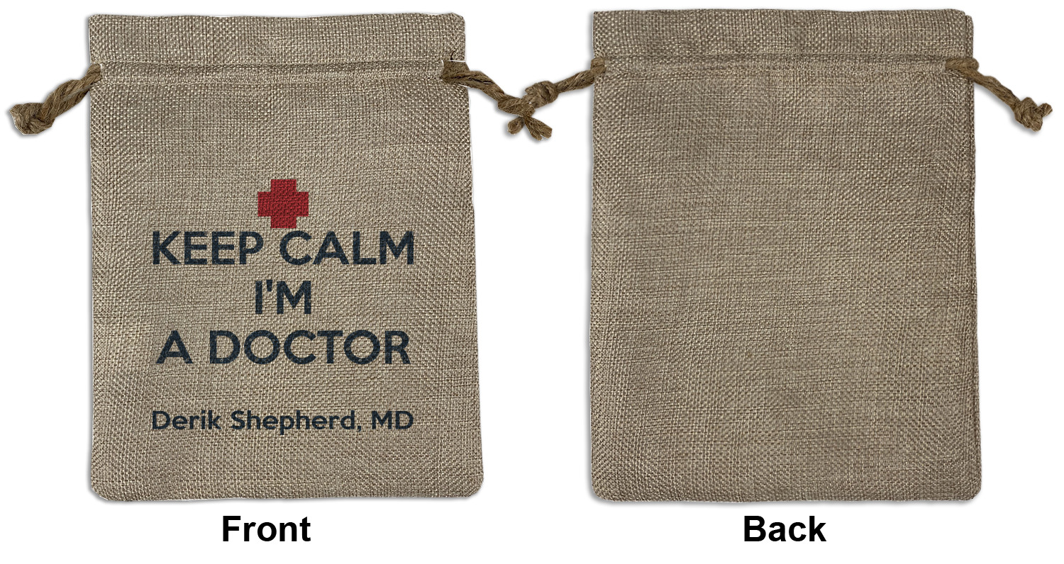 We sell our Burlap Gift Bags in 3 variant sized bags. Made with burlap polyester, each personalized bag can be secured with a twine drawstring pull. Your custom design is available to print on one side or both sides - completely up to you! The sizes of the bags measure approximately 4.5" x 6.5" for the smallest size, 6.5" x 8.0" for the medium size, and 6.5" x 13.5" for the large-sized bag.