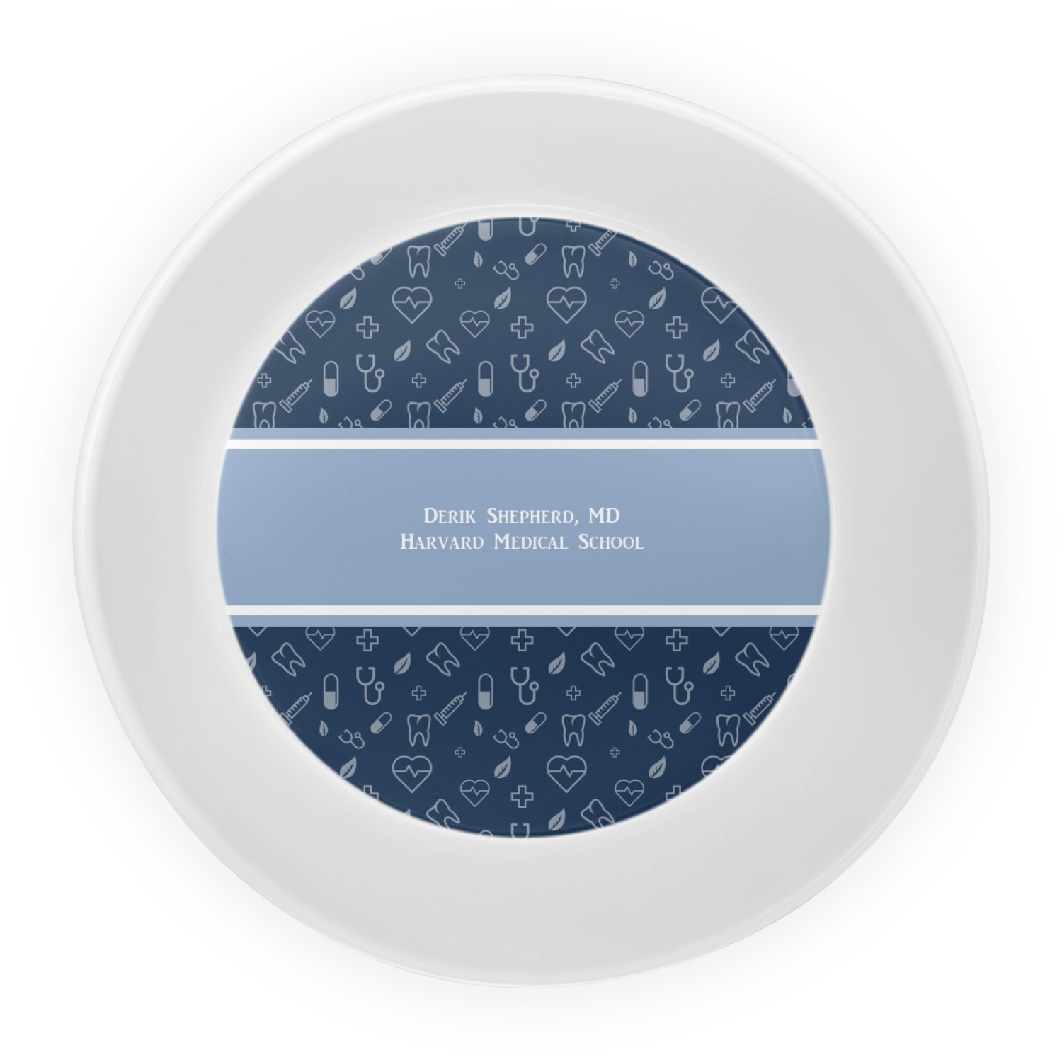 This design features a subtle background with different medical symbols. It is a navy blue with cream accents. There is a large ribbon where your personalization goes! The coordinating design features a quote that says "keep calm, I'm a doctor." This is such a fun design for any medical doctor!