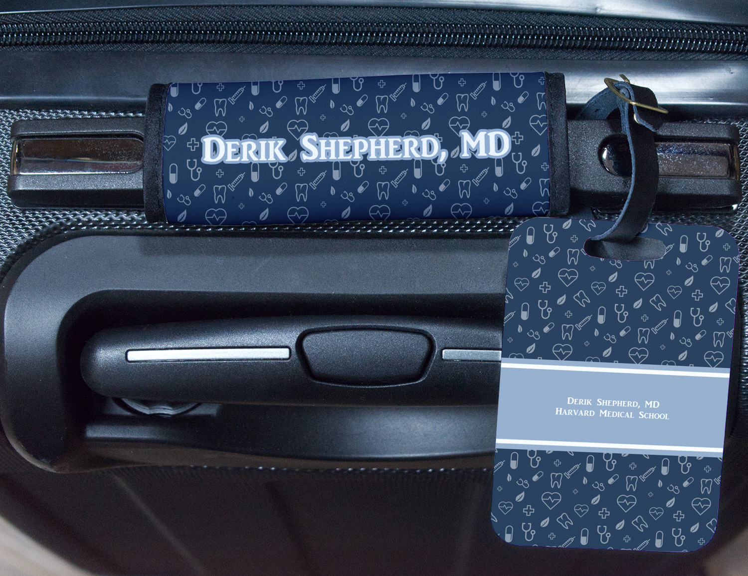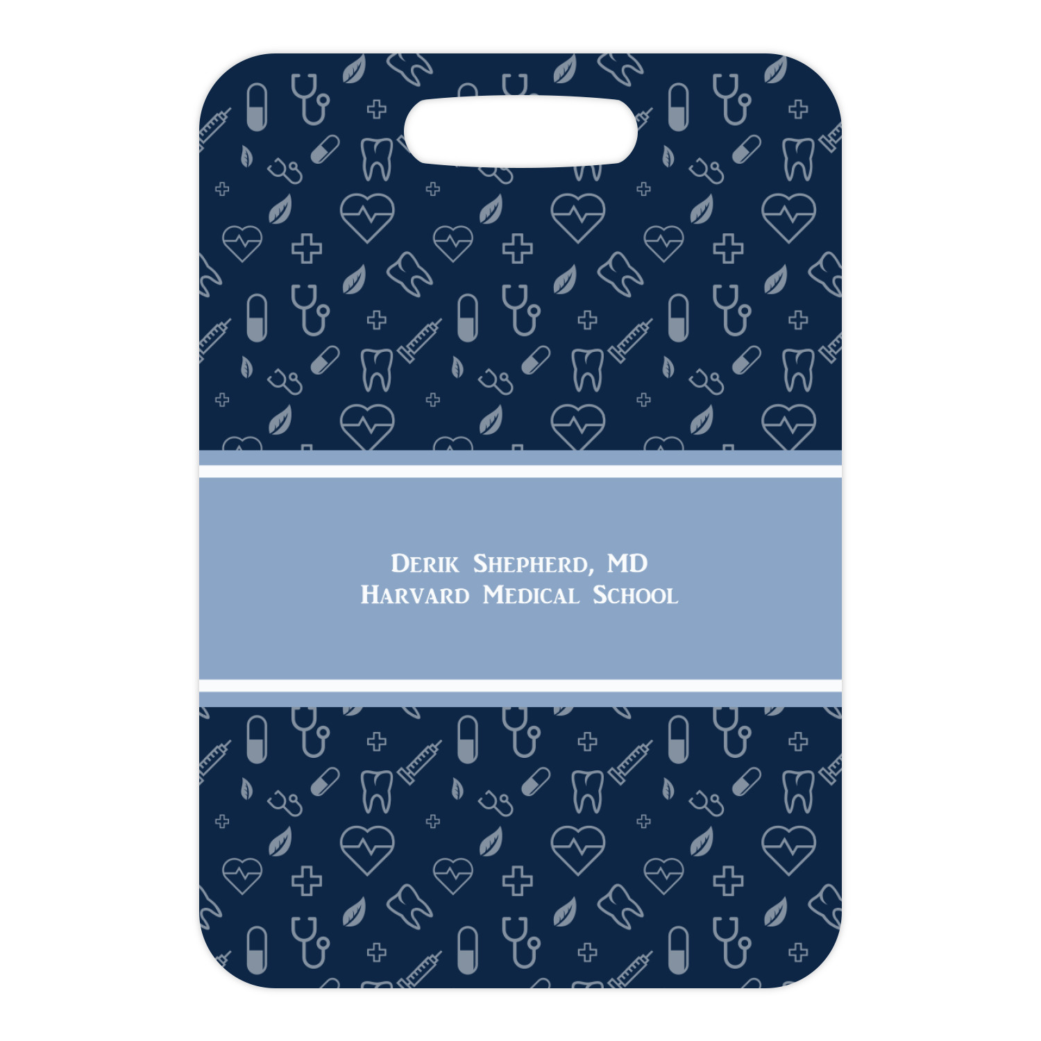 This design features a subtle background with different medical symbols. It is a navy blue with cream accents. There is a large ribbon where your personalization goes! The coordinating design features a quote that says "keep calm, I'm a doctor." This is such a fun design for any medical doctor!