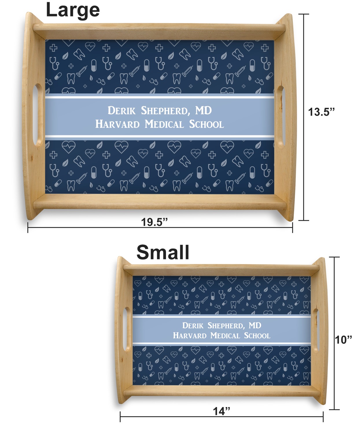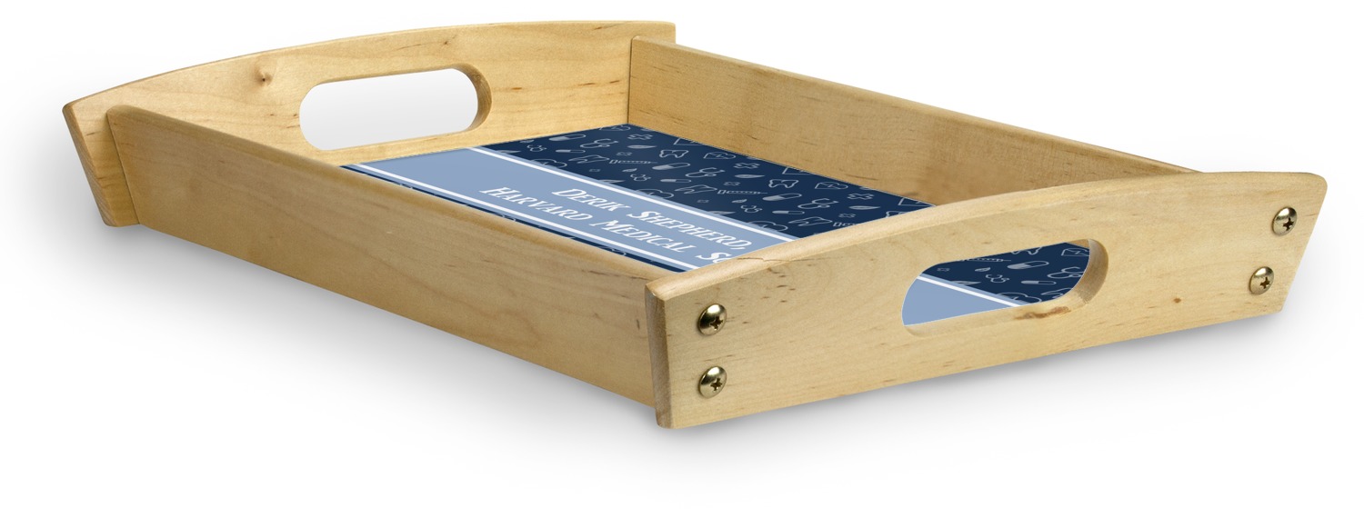This serving tray with handles features square edges and two rounded sides, creating a very modern look. Each side is fabricated from a beautifully cut, natural wood. The bottom of the interior of the tray displays your customized design in bright, vibrant color. The tray is sold in both a black color and a natural wood look. Each variation of the wood serving tray has two sizes: Small, which is 14" x 10" x 2.25", and Large, which is 19.5" x 13.5" x 2.75".