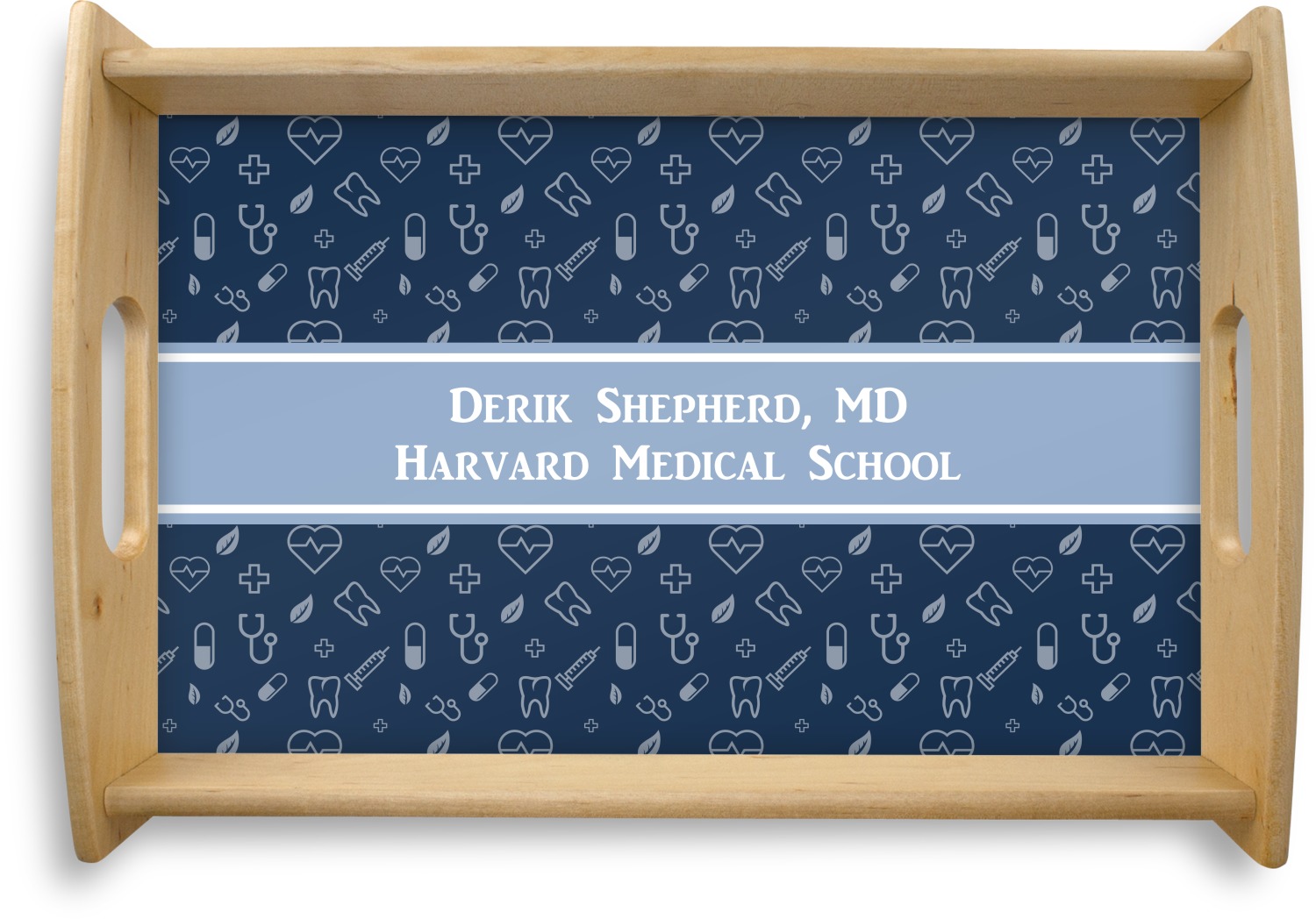This design features a subtle background with different medical symbols. It is a navy blue with cream accents. There is a large ribbon where your personalization goes! The coordinating design features a quote that says "keep calm, I'm a doctor." This is such a fun design for any medical doctor!