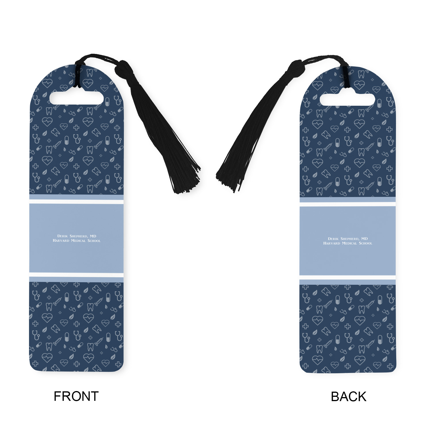 Made from a durable, flexible plastic, these bookmarks are printed with your custom design on them. With the tassel on them they make it easy to find your page in your book. These are a rectangular shape 7 1/4 inches tall with a rounded top and are approximately 2 1/4 inches wide.