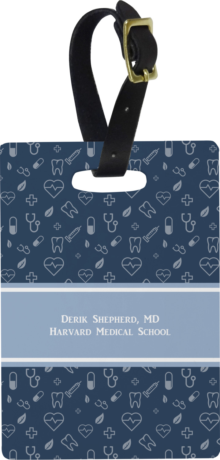These personalized bag tags are sold in a variety of shapes, so that you may find the product that meets your vision exactly. We sell a round luggage tag, which measures at approximately 4" x 4". Our square luggage tag is about 3.5" x 3.5", while our rectangular version is 2.75" x 4 ".