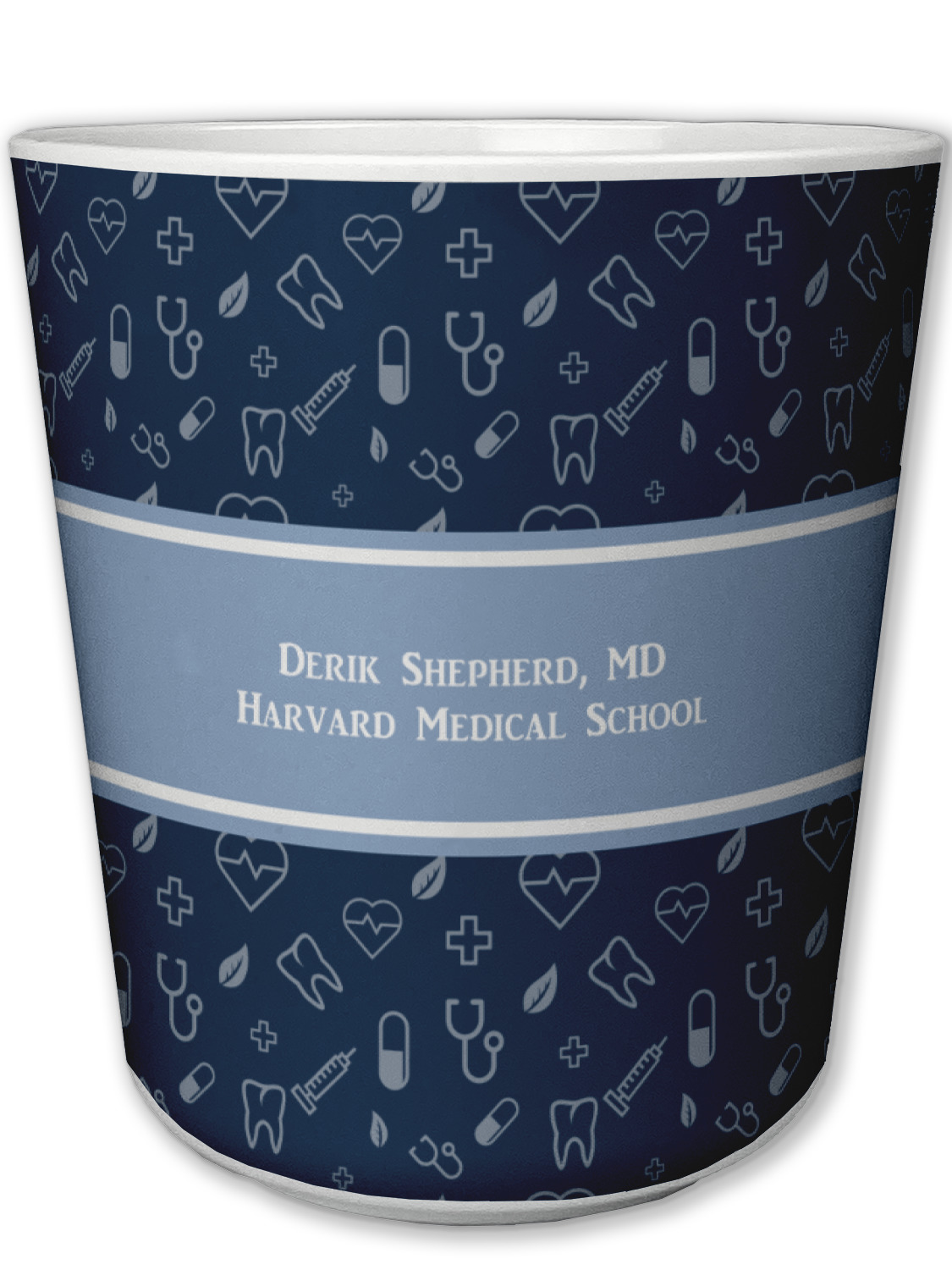 This design features a subtle background with different medical symbols. It is a navy blue with cream accents. There is a large ribbon where your personalization goes! The coordinating design features a quote that says "keep calm, I'm a doctor." This is such a fun design for any medical doctor!