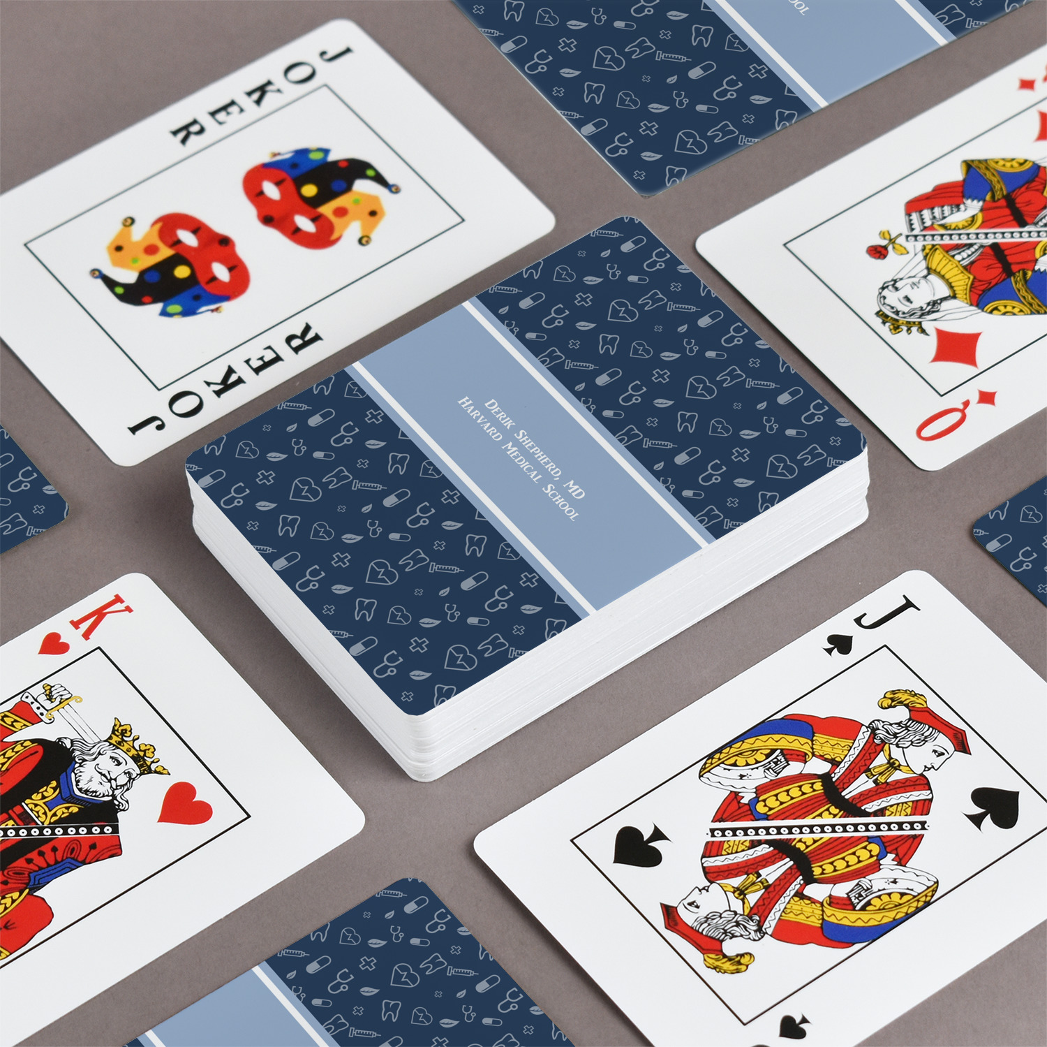 Our playing cards are perfect for family game nights or poker nights. A deck of customized playing cards ups the level of fun & entertainment to your game or poker nights. Imagine playing cards customized to match the theme of your game room, or game night, or that special event, or occasion with gambling tables!