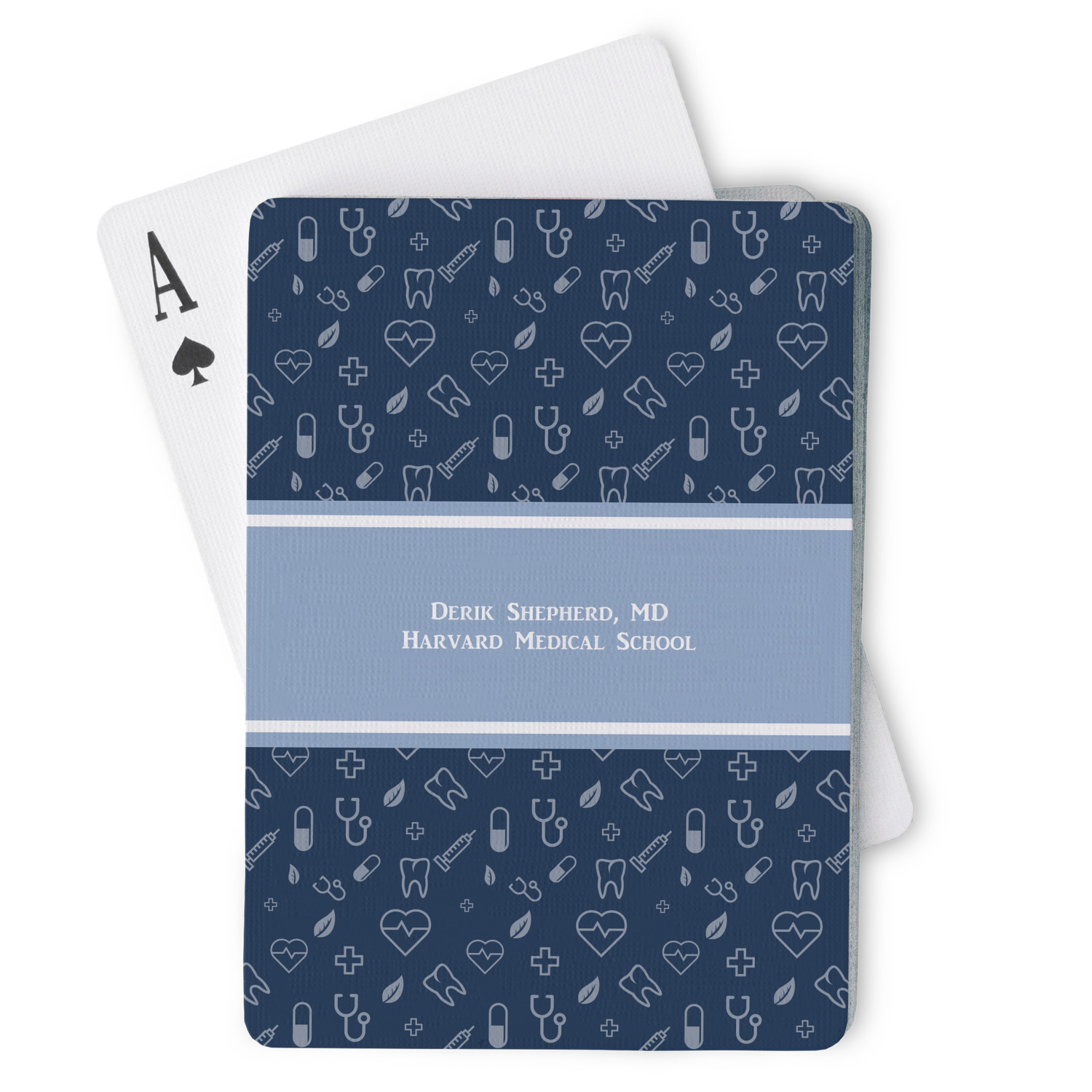 The customization / personalization is printed on the back side. The playing cards have a low gloss coating on both sides. The cards are packaged in a clear plastic box.