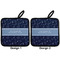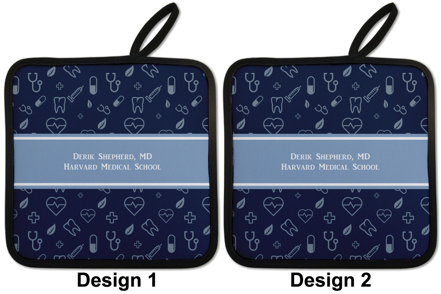 Our personalized pot holders feature a neoprene front that displays your personalization in vibrant colors. The backing of the hot pot holder is rubberized; the textured backing allows you to have a great grip when using this custom pot holder. The two materials are joined with a sleek, black trim, and the holder also includes an attached loop for hanging and storage. The pot holder is approximately 8.75 inches by 8.75 inches and 0.25 inches tall, while the fabric loop is 2.5 inches long. You can purchase a kitchen pot holder by itself or as a set of 2. We also offer a set including one pot holder and one oven mitt.