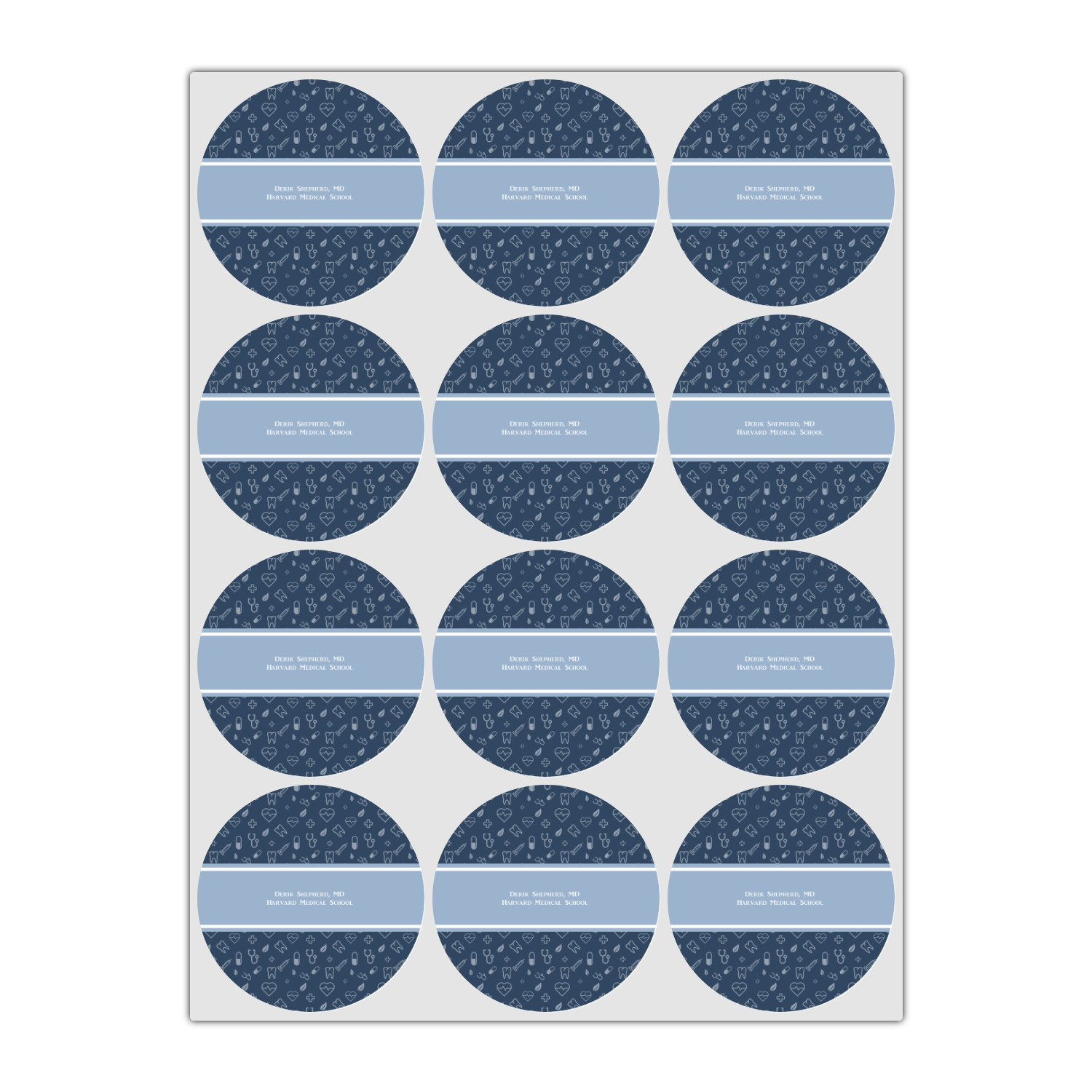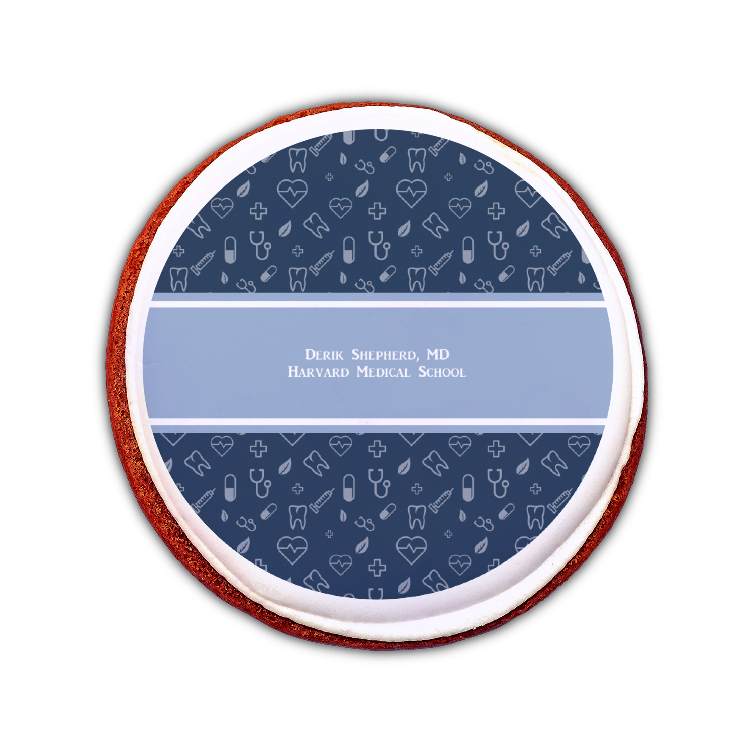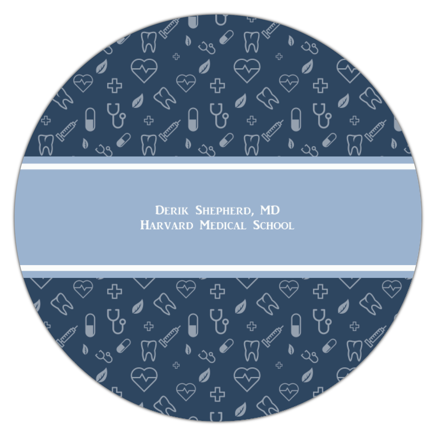 This design features a subtle background with different medical symbols. It is a navy blue with cream accents. There is a large ribbon where your personalization goes! The coordinating design features a quote that says "keep calm, I'm a doctor." This is such a fun design for any medical doctor!