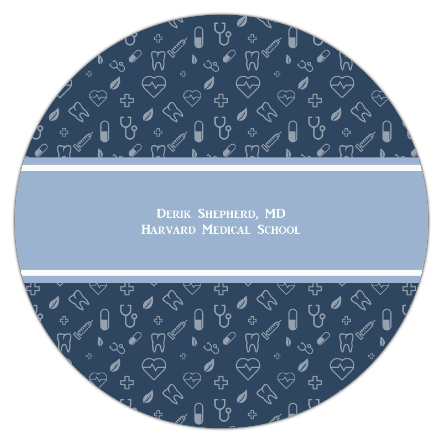 This design features a subtle background with different medical symbols. It is a navy blue with cream accents. There is a large ribbon where your personalization goes! The coordinating design features a quote that says "keep calm, I'm a doctor." This is such a fun design for any medical doctor!