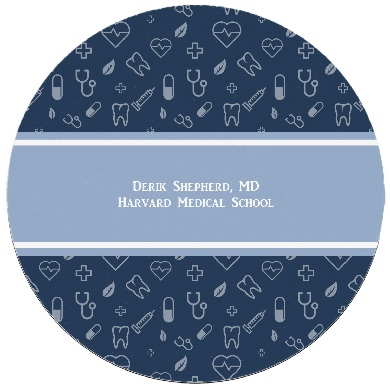 This design features a subtle background with different medical symbols. It is a navy blue with cream accents. There is a large ribbon where your personalization goes! The coordinating design features a quote that says "keep calm, I'm a doctor." This is such a fun design for any medical doctor!