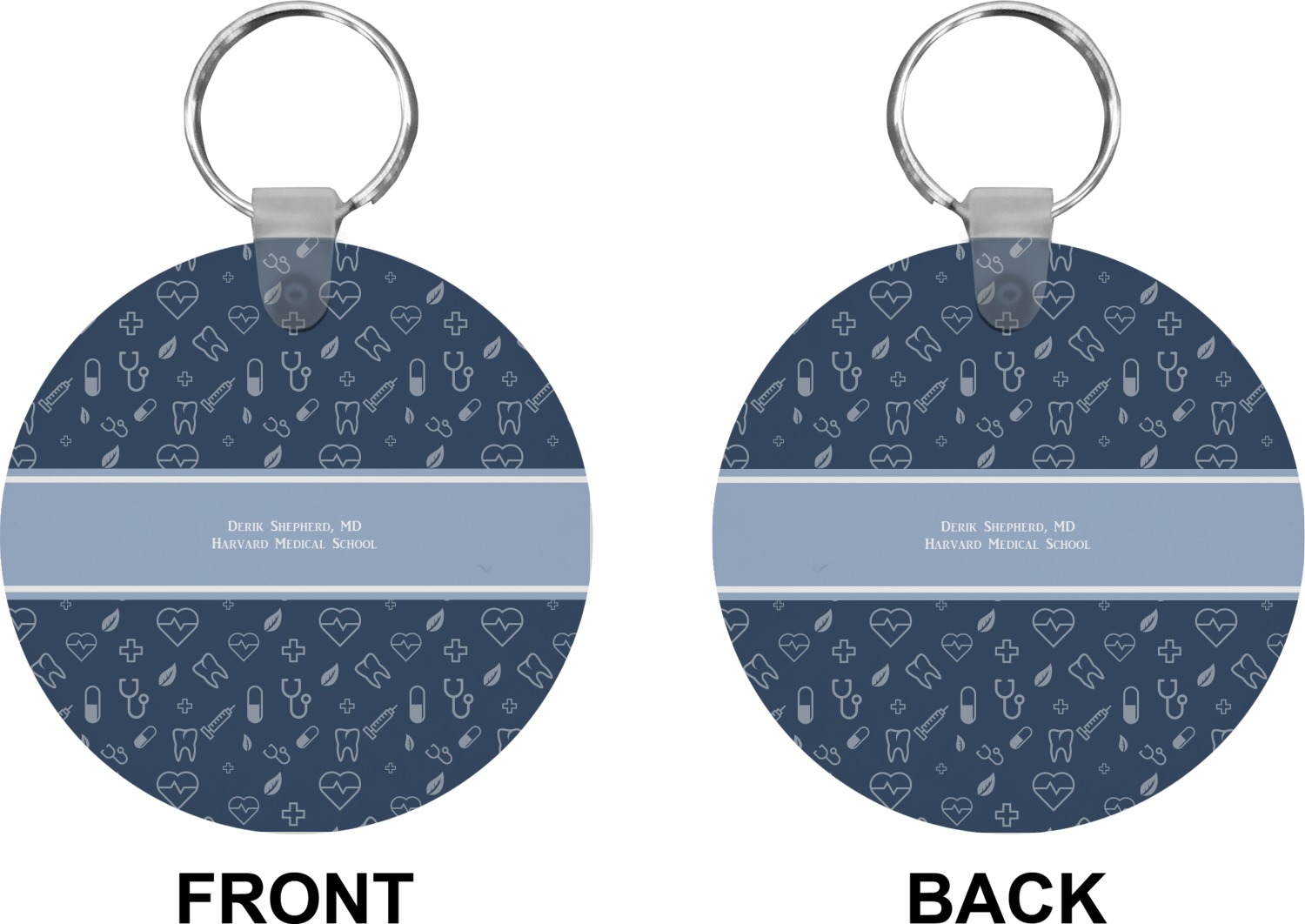 This design features a subtle background with different medical symbols. It is a navy blue with cream accents. There is a large ribbon where your personalization goes! The coordinating design features a quote that says "keep calm, I'm a doctor." This is such a fun design for any medical doctor!