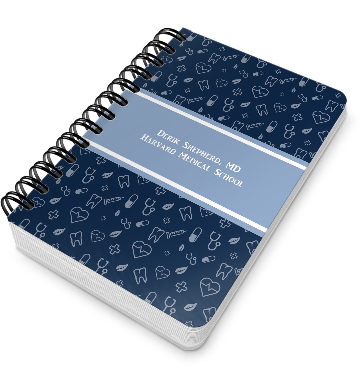 This spiral notebook includes 75 sheets of thick, ruled paper. The front and back of this custom notebook is made of a robust, laminate, plastic covering. We print your personalization on these two panels, underneath a glossy finish, which emphasizes the colors of your design. The two panels and the sheets of paper are held together by a sturdy, black coil. The paper within your bound notebook is perforated for easy, clean tearing.