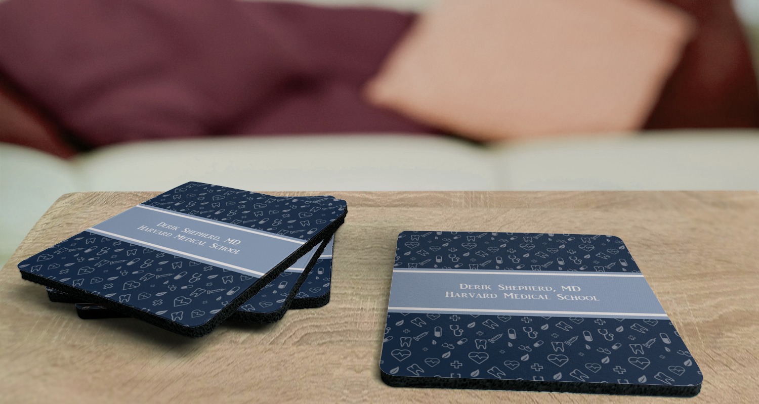 These drink coasters have a smooth, polyester top and a textured, rubber backing on its bottom. The non-slip rubber backing underneath works to keep any spills at bay. At 4 by 4 by 0.25 inches thick, these custom coasters are a suitable size for most drinkware. Your personalization is displayed atop the face of the cup coaster. We sell these rubber coasters in two different shapes: square and round. You can buy each shape as singulars or as a set of 4.