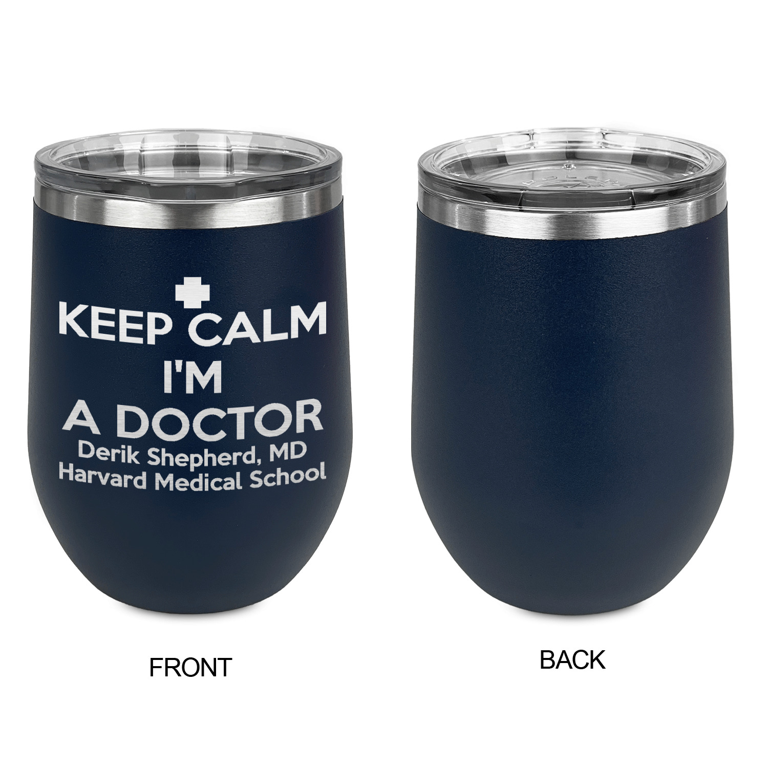 This design features a subtle background with different medical symbols. It is a navy blue with cream accents. There is a large ribbon where your personalization goes! The coordinating design features a quote that says "keep calm, I'm a doctor." This is such a fun design for any medical doctor!