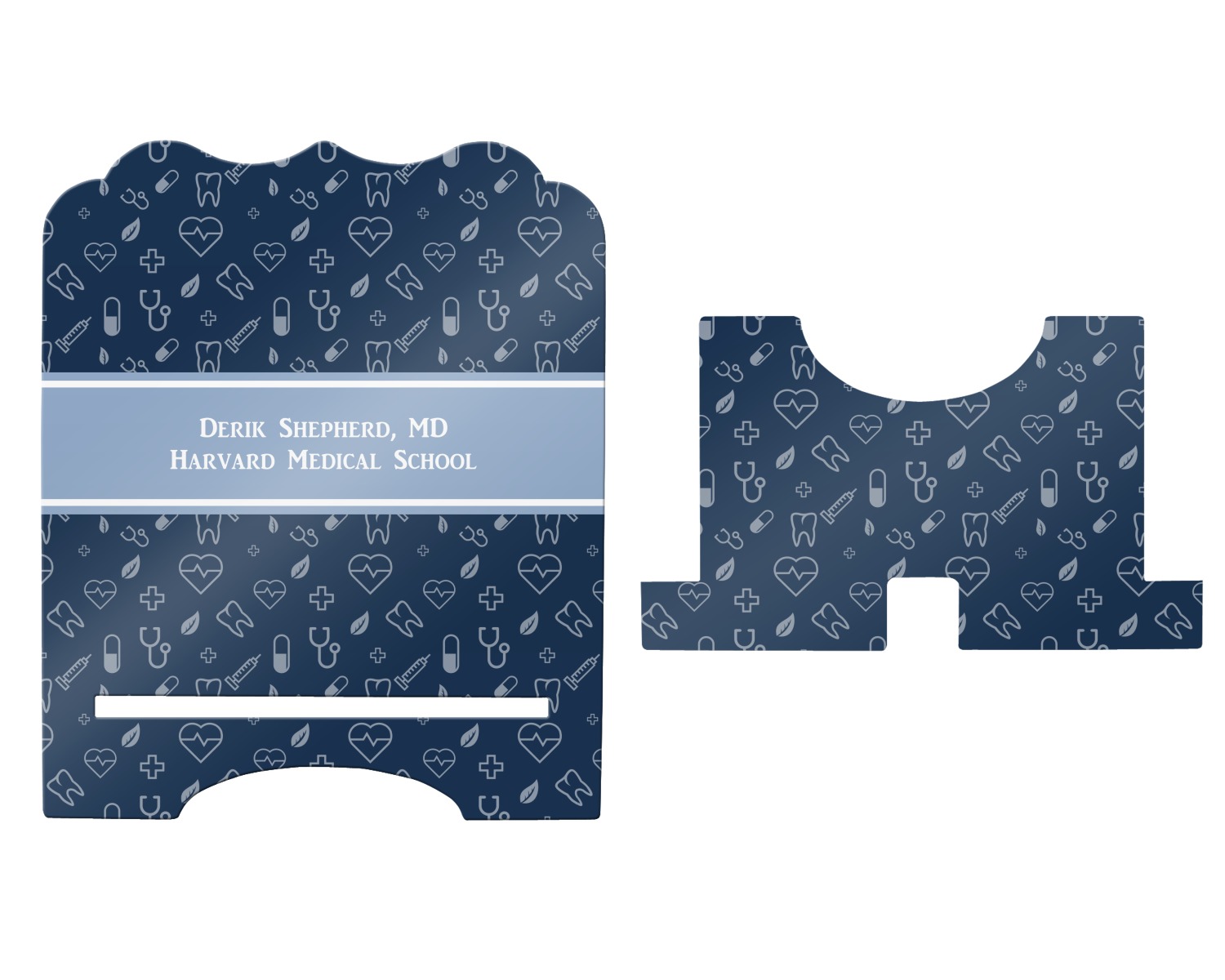 This design features a subtle background with different medical symbols. It is a navy blue with cream accents. There is a large ribbon where your personalization goes! The coordinating design features a quote that says "keep calm, I'm a doctor." This is such a fun design for any medical doctor!