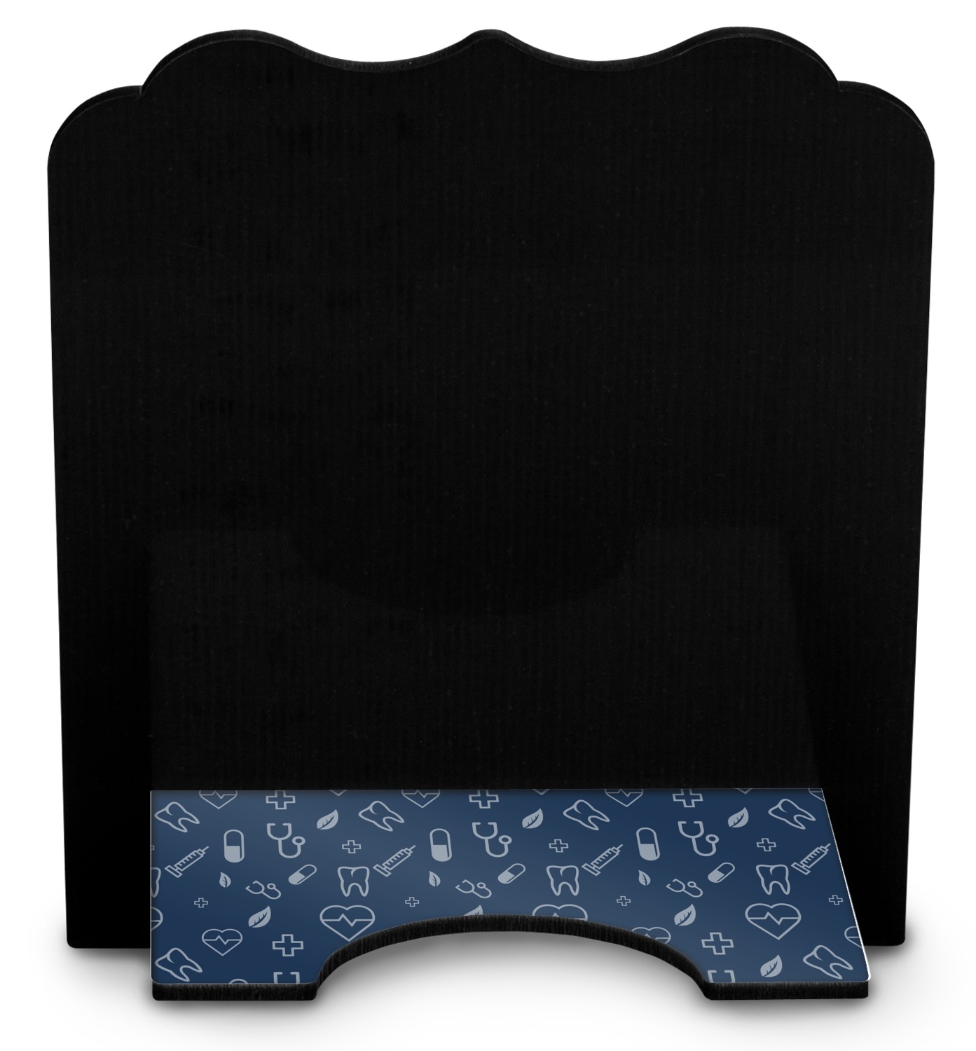 The stand is comprised of two hardboard pieces that fit snugly together and stabilize one another. The bottom part of the iPad stand supports your tablet, and has space for your tablets charger while in use. At 9.25" x 11.5", this tablet mount can support a device between the sizes of the iPad Pro and the iPad Mini 2. The uppermost part of the stand features a decorative, curved edge for a classy, suave appearance. We print your customization atop the face of the stand, in vibrant color. The remaining sides are colored a sleek black.