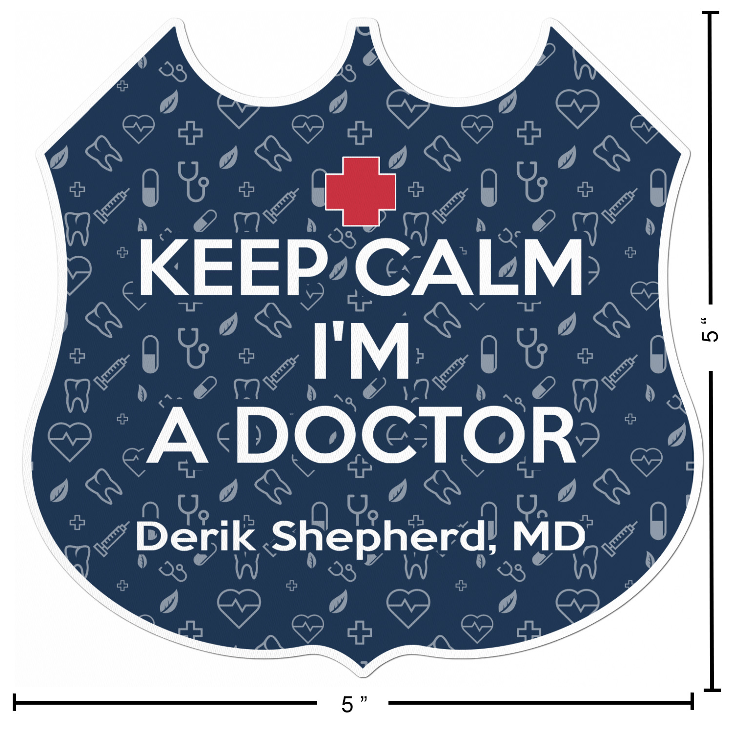 This design features a subtle background with different medical symbols. It is a navy blue with cream accents. There is a large ribbon where your personalization goes! The coordinating design features a quote that says "keep calm, I'm a doctor." This is such a fun design for any medical doctor!