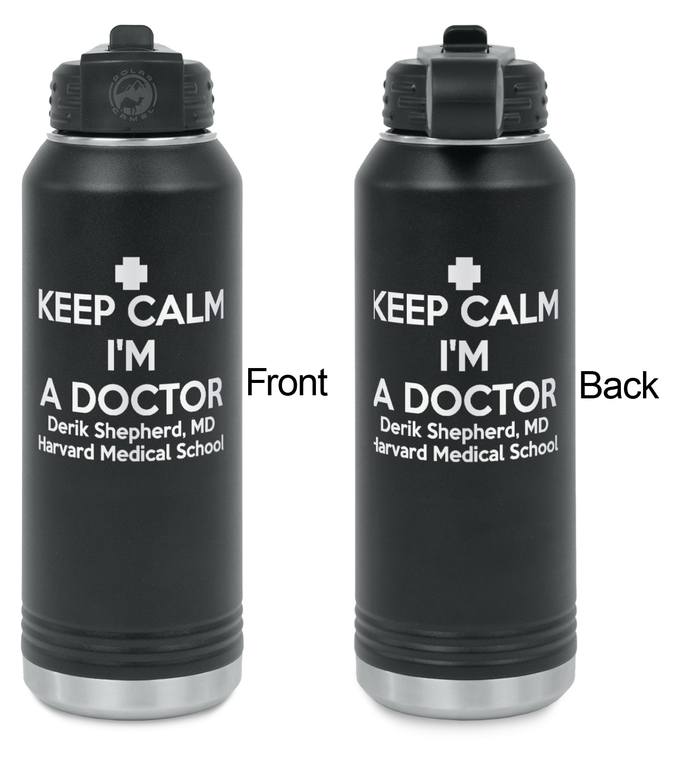 This design features a subtle background with different medical symbols. It is a navy blue with cream accents. There is a large ribbon where your personalization goes! The coordinating design features a quote that says "keep calm, I'm a doctor." This is such a fun design for any medical doctor!